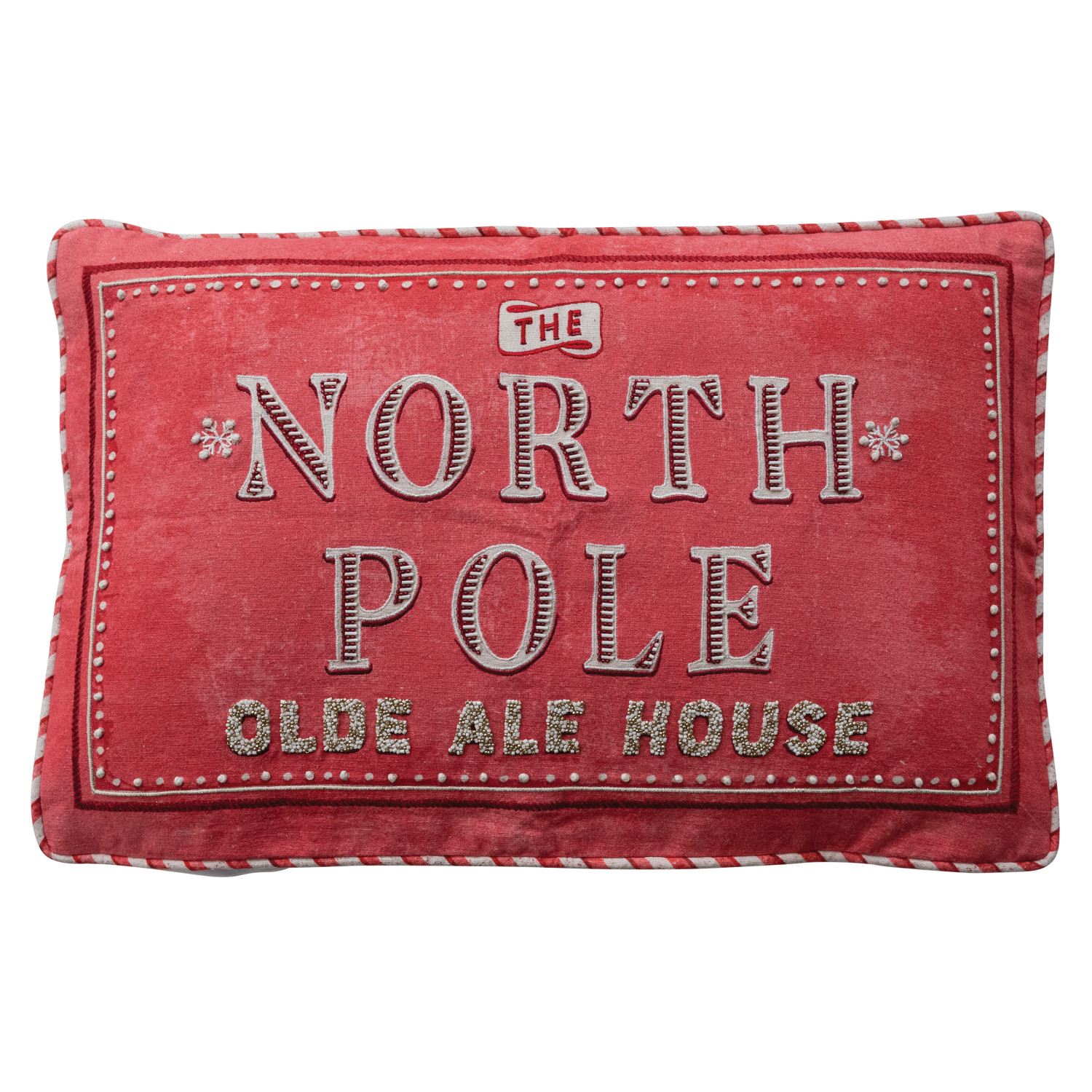 Catalog Name: 24"L x 16"H Cotton Printed Lumbar Pillow w/ Metallic Silver Thread, Embroidery, Beads, Striped Piping & Velvet Back "The North Pole…", Red, Silver & Cream Color ©