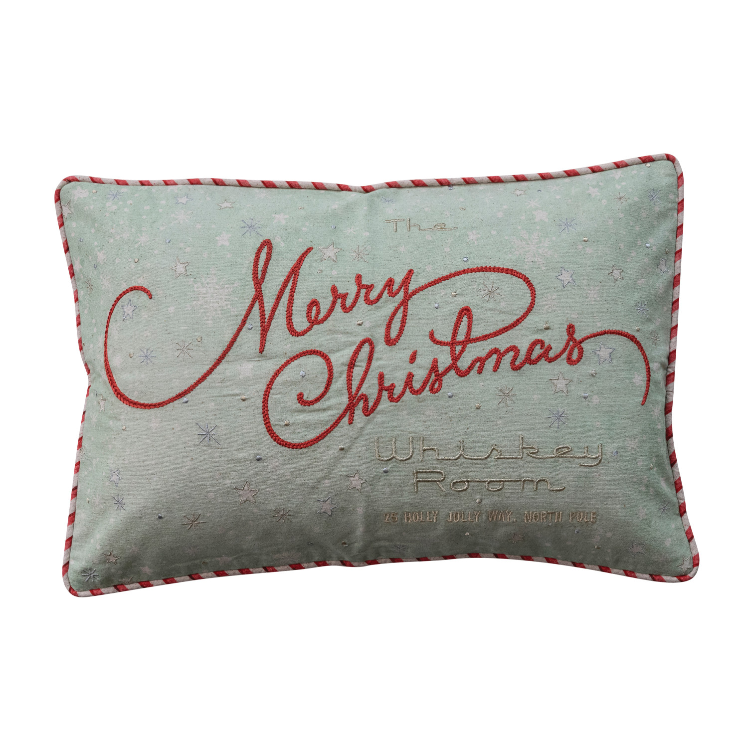 Catalog Name: 24"L x 16"H Cotton & Linen Printed Lumbar Pillow w/ Metallic Silver Thread, Embroidery, Striped Piping & Velvet Back "The Merry Christmas...", Multi Color ©