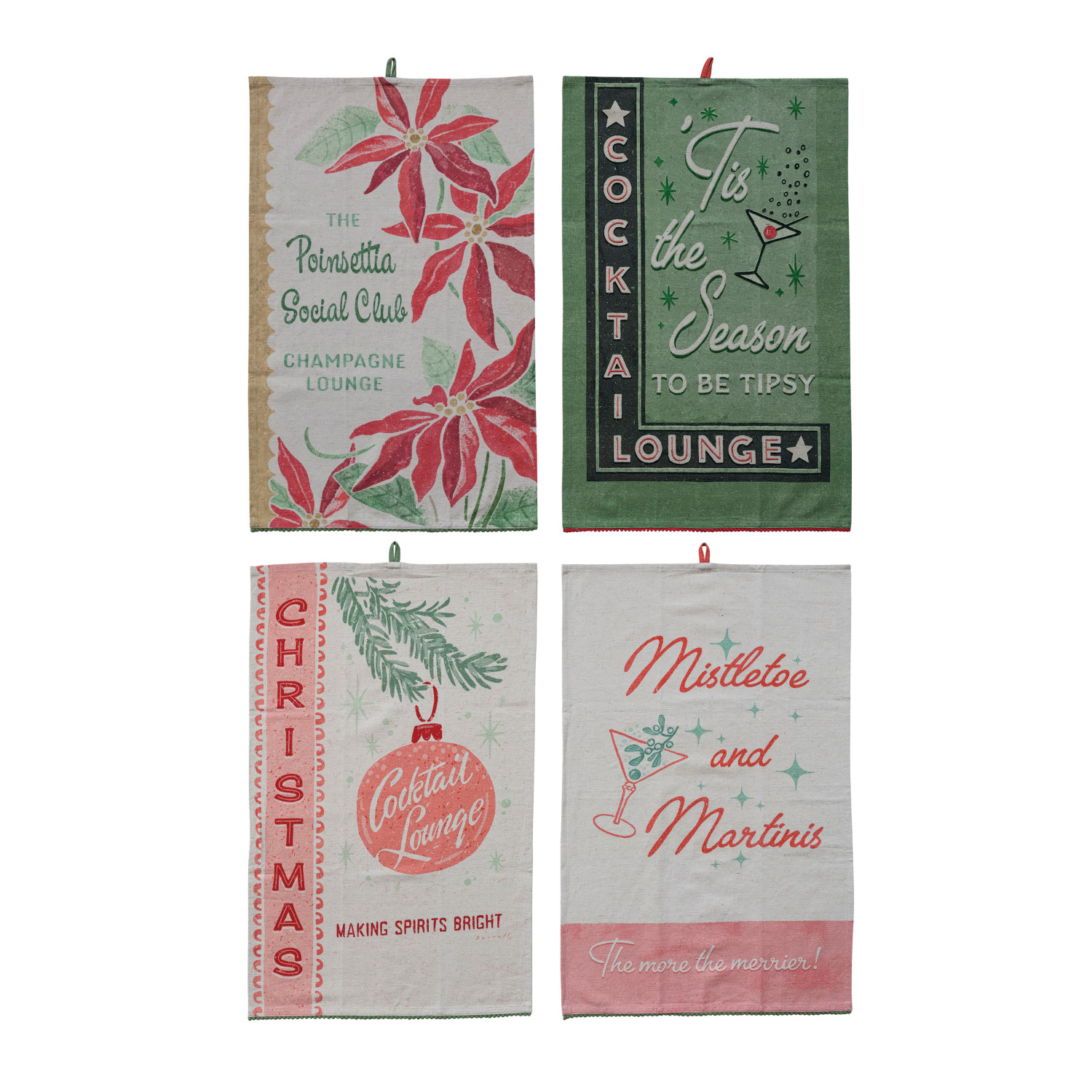 Cotton & Linen Printed Tea Towel with Holiday Bar Saying, Image & Pom Pom Trim, 4 Styles ©