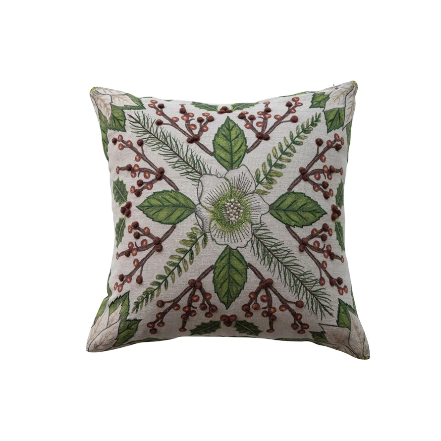 Catalog Name: 20" Square Linen Printed Pillow w/ Seasonal Botanicals, Pom Poms, Embroidery & Cotton Back, Multi Color ©