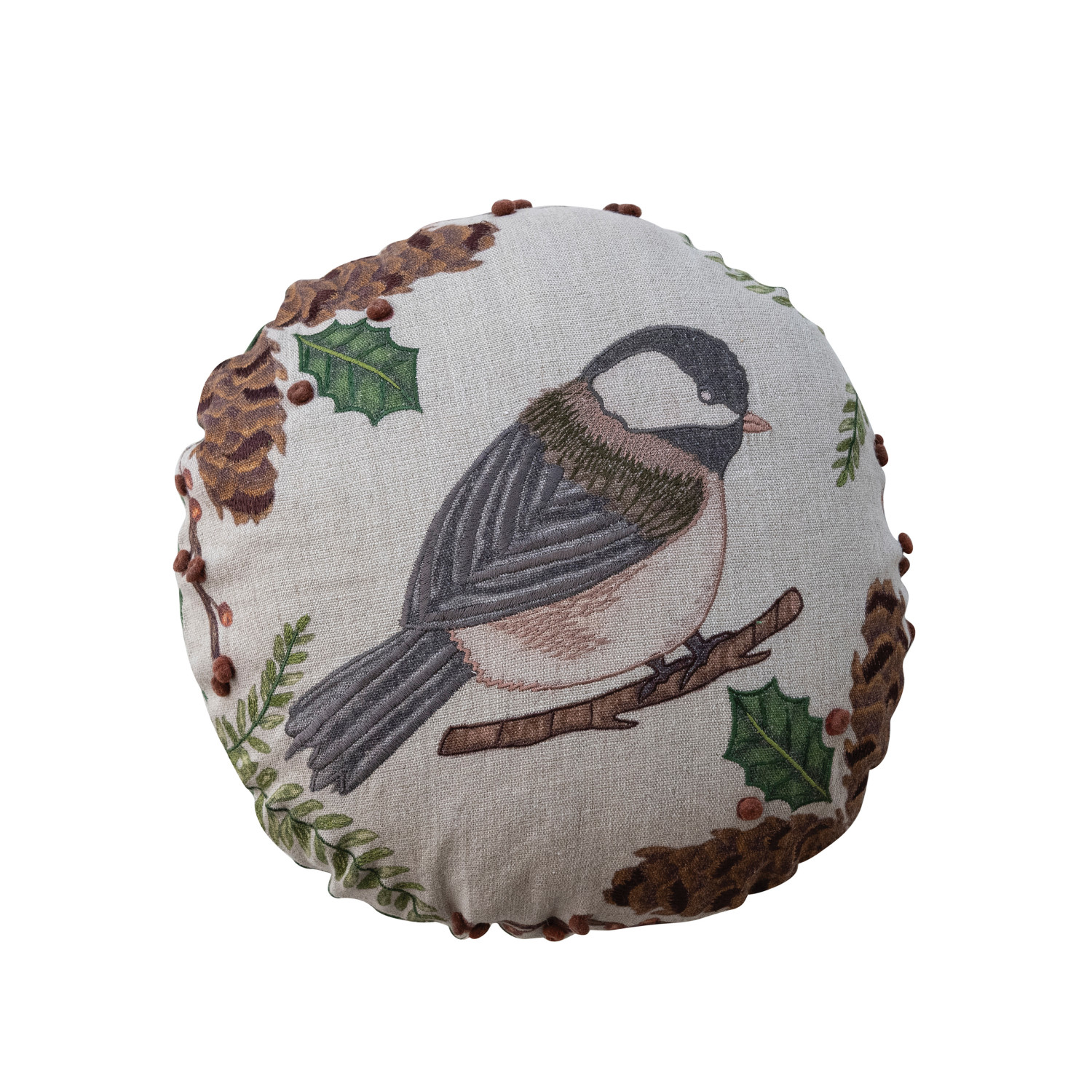 Catalog Name: 16" Round Linen Printed Pillow w/ Seasonal Botanicals, Bird, Embroidery & Cotton Back, Multi Color ©