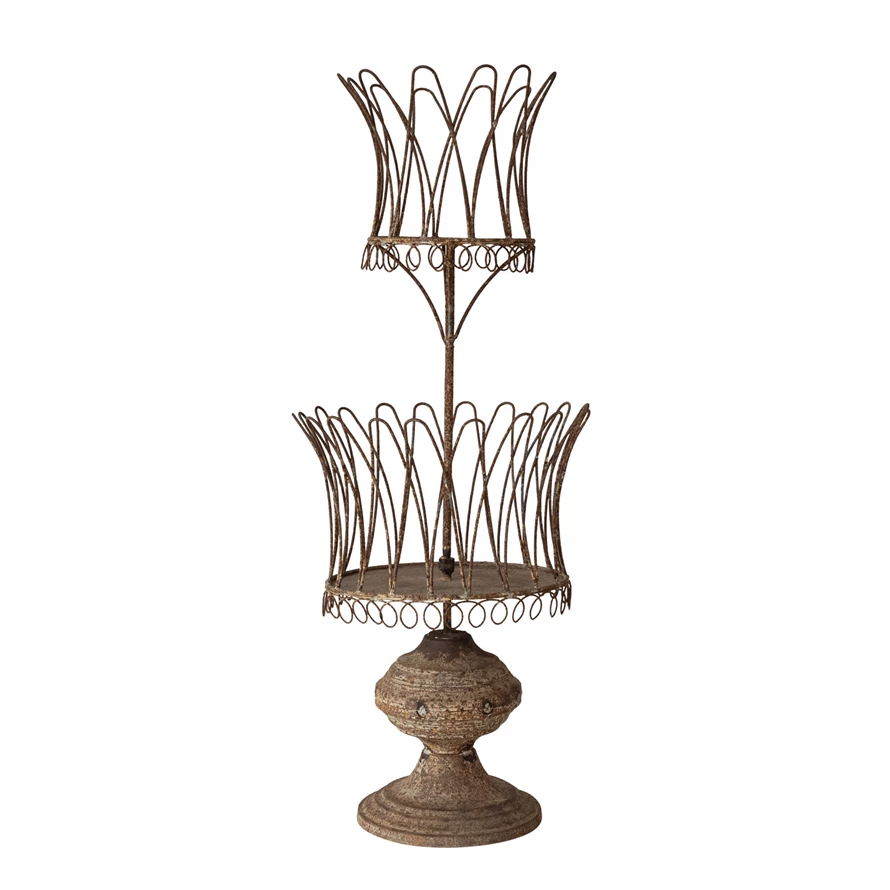 Catalog Name: 11-1/4" Round x 28"H Decorative Metal Wire Footed 2-Tier Tray, Heavily Distressed Rust Finish