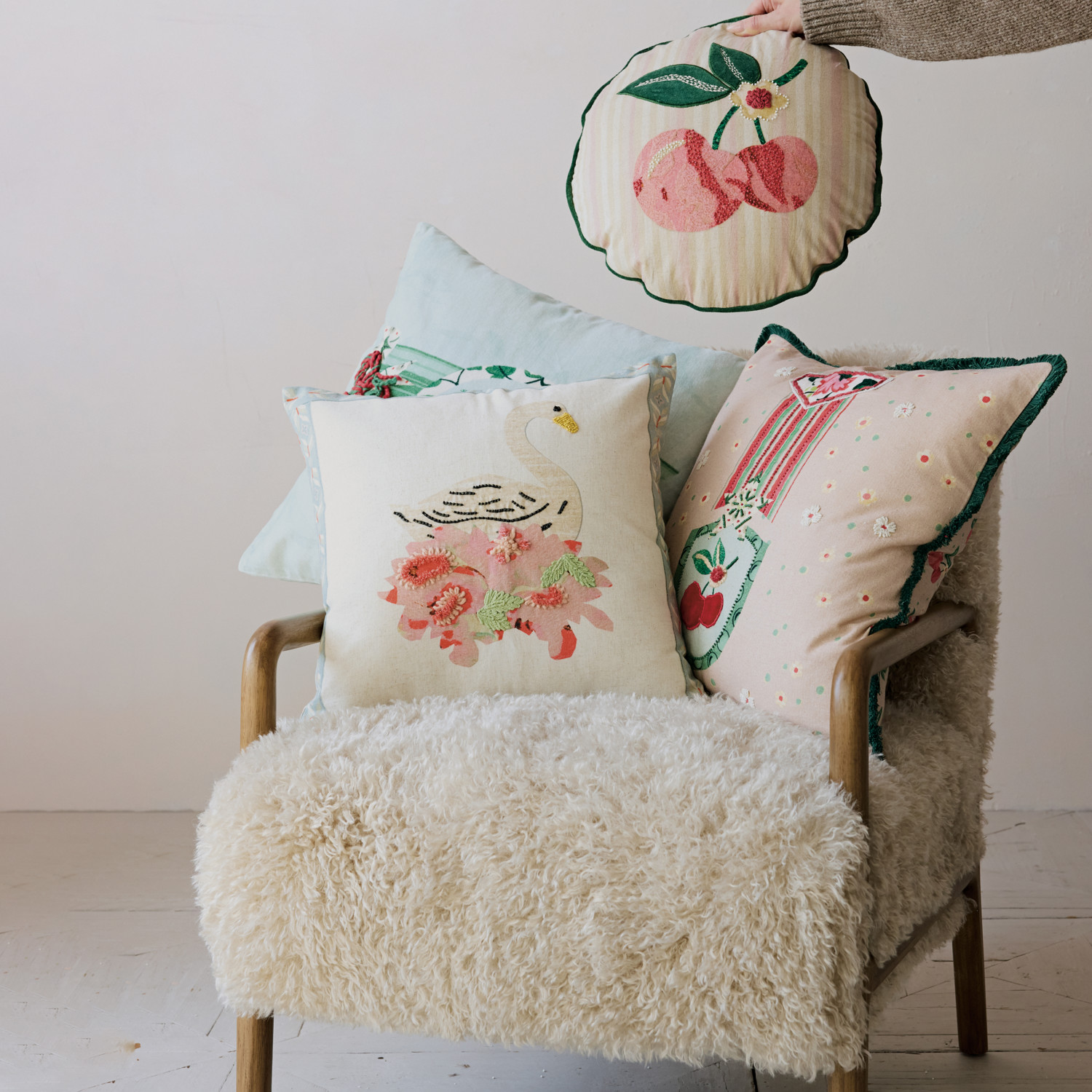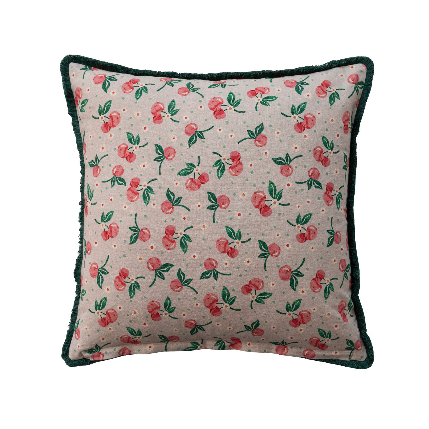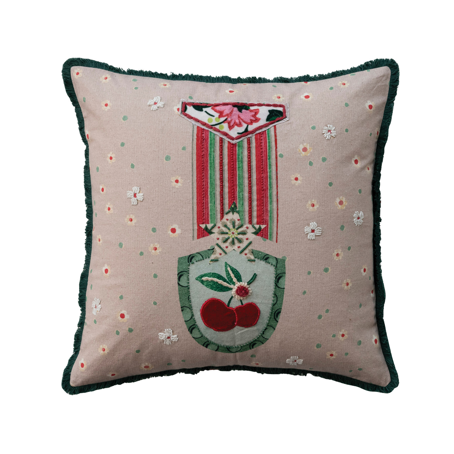 Catalog Name: 20" Square Cotton & Linen Printed Pillow w/ Medal, Embroidery, Applique, Tufted Fringe & Cherries Patterned Back, Multi Color ©