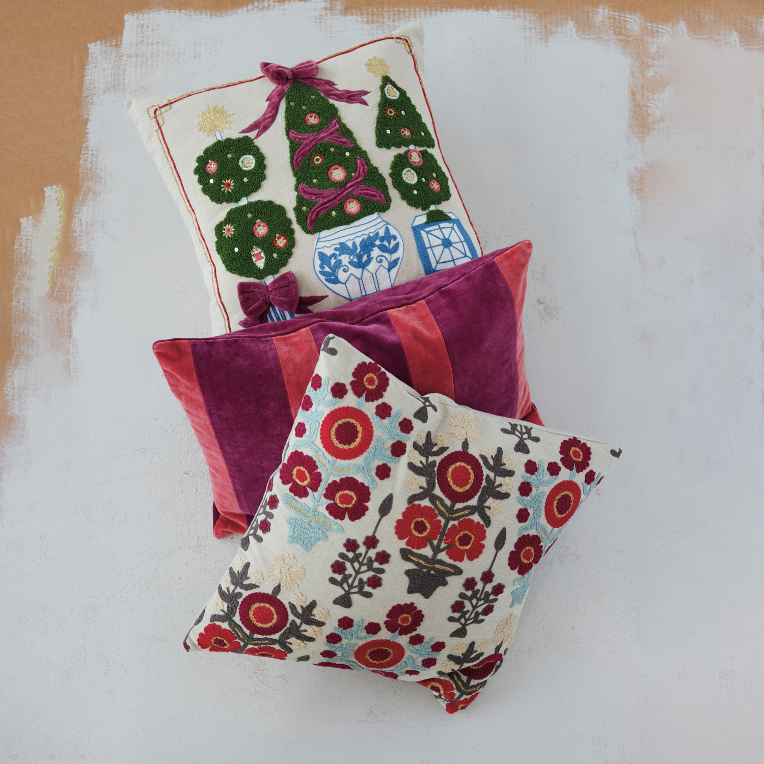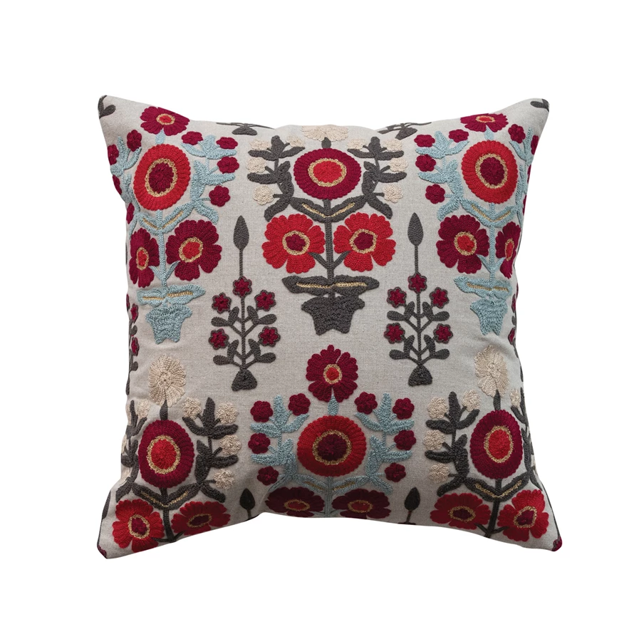 Catalog Name: 18" Square Cotton Chambray Pillow w/ Embroidered Floral Pattern, Multi Color