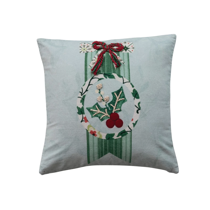 20" Square Cotton Velvet Printed Pillow with Bow, Flowers, Holly Emblem & Embroidery ©