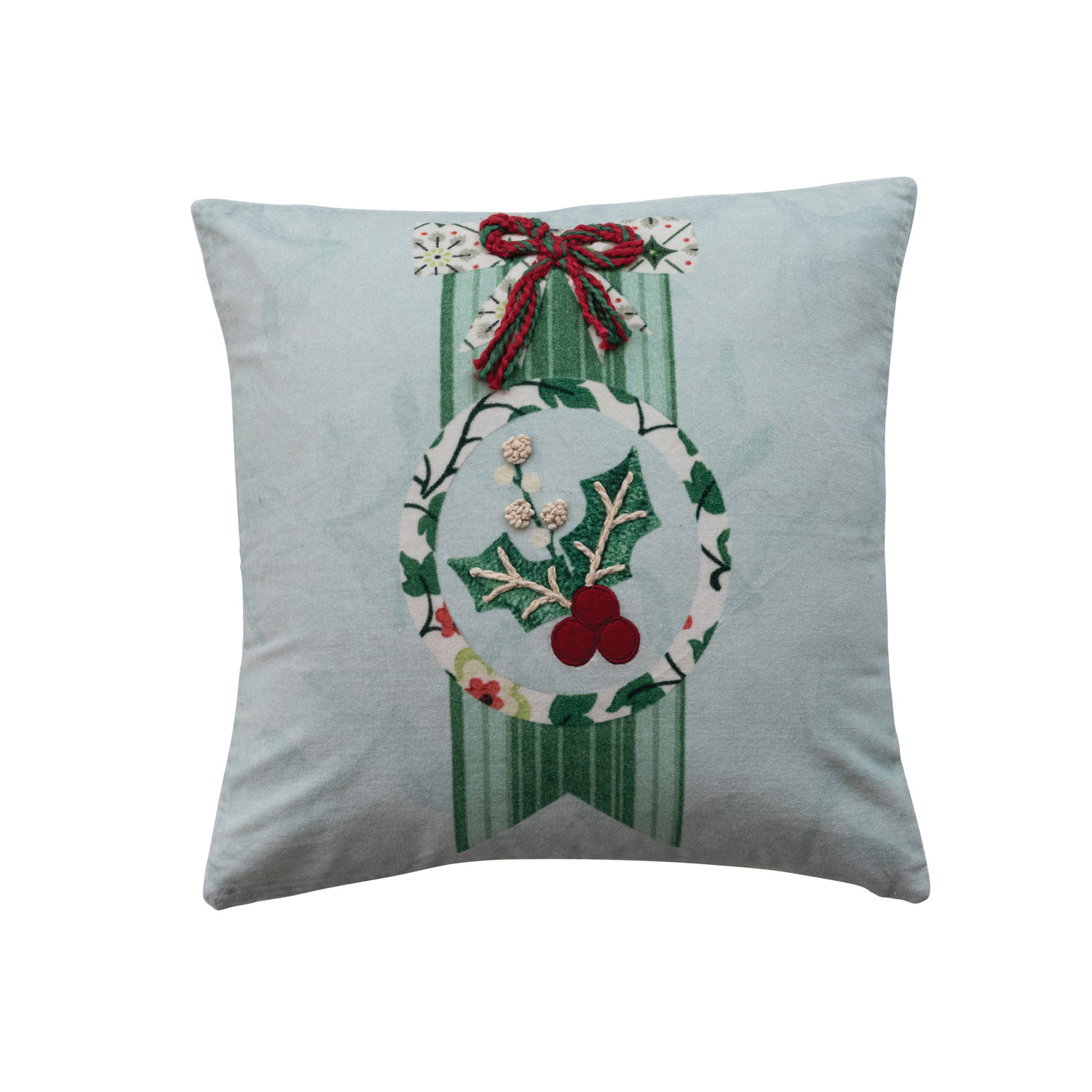 Catalog Name: 20" Square Cotton Velvet Printed Pillow w/ Bow, Flowers, Holly Emblem & Embroidery, Multi Color ©