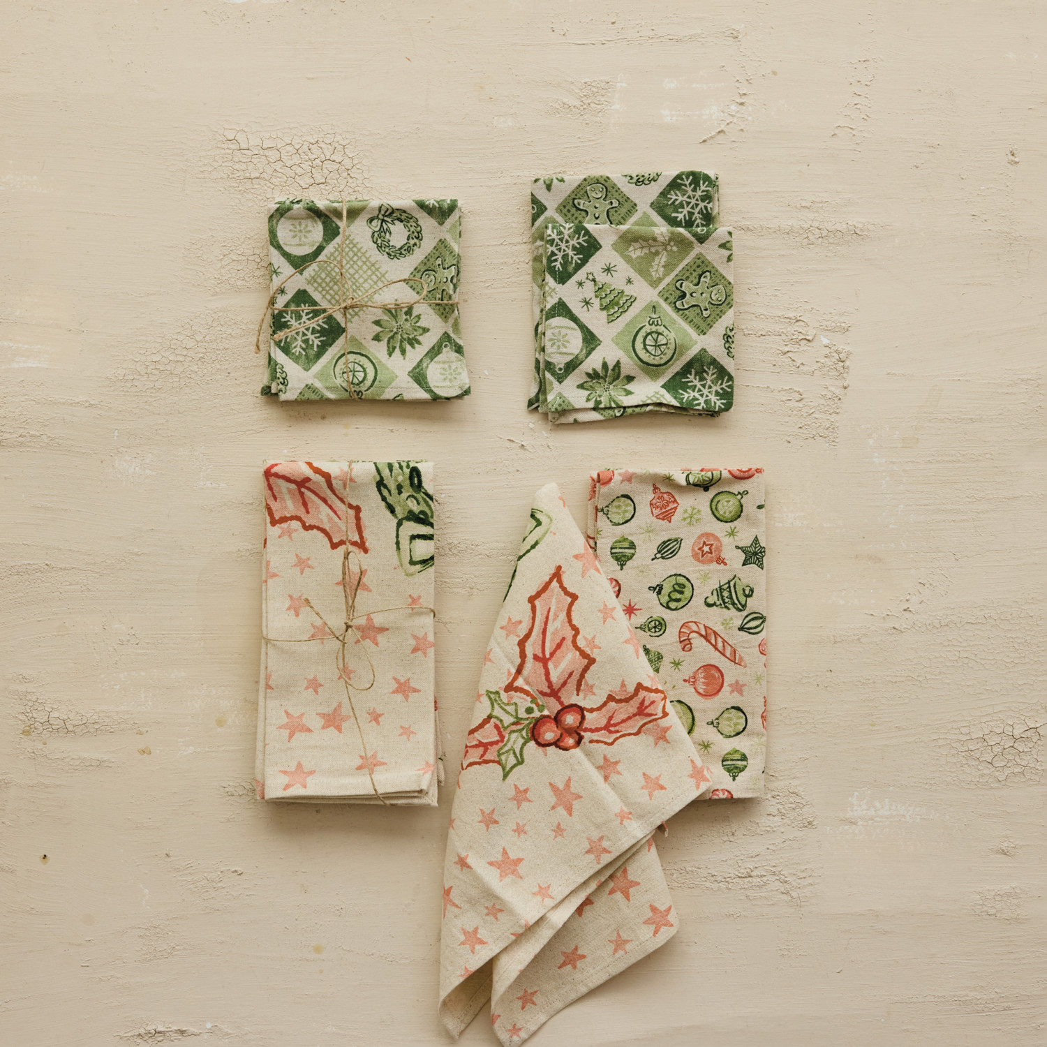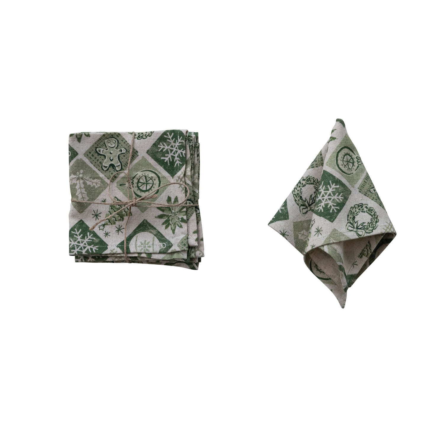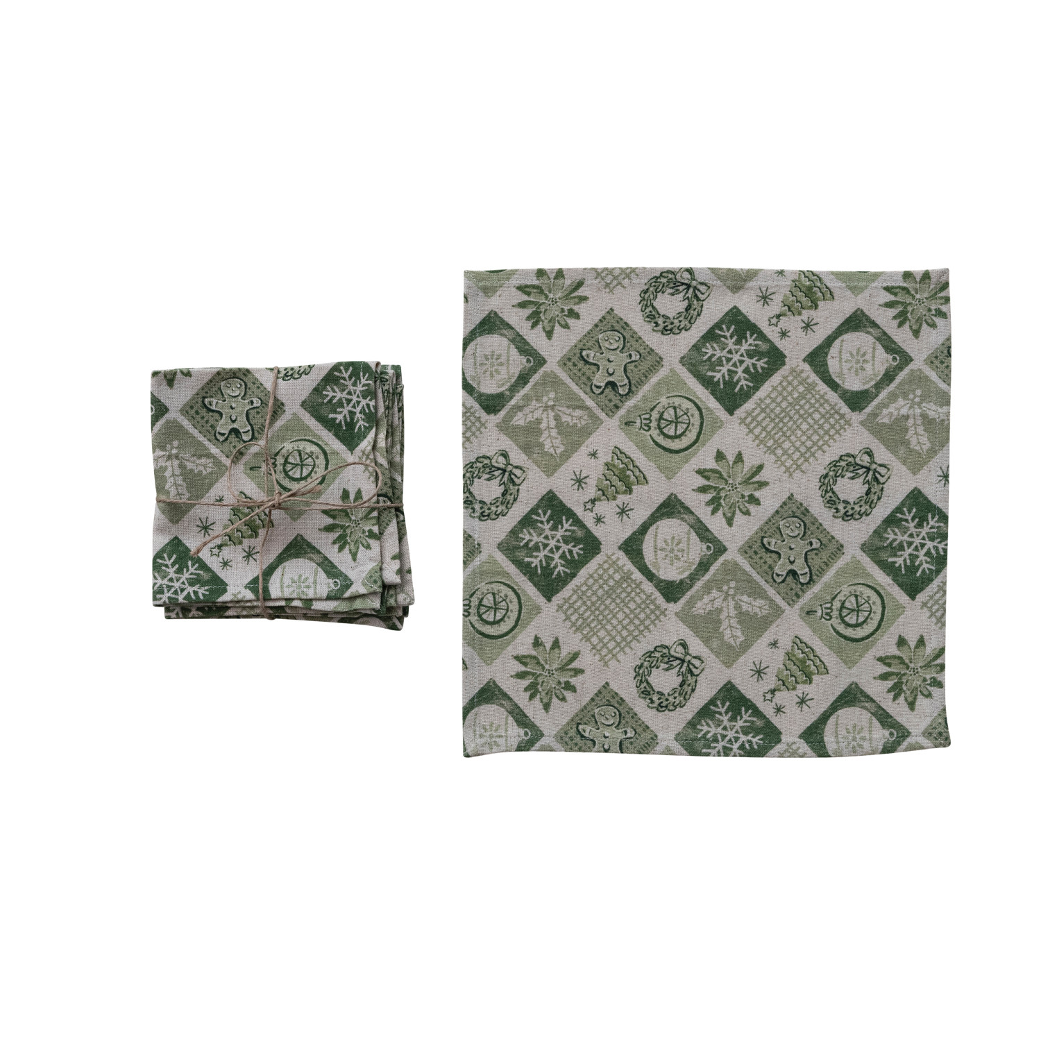 Catalog Name: 10" Square Cotton & Linen Printed Napkins w/ Holiday Pattern, Green & Cream Color, Set of 4 Tied w/ Jute ©