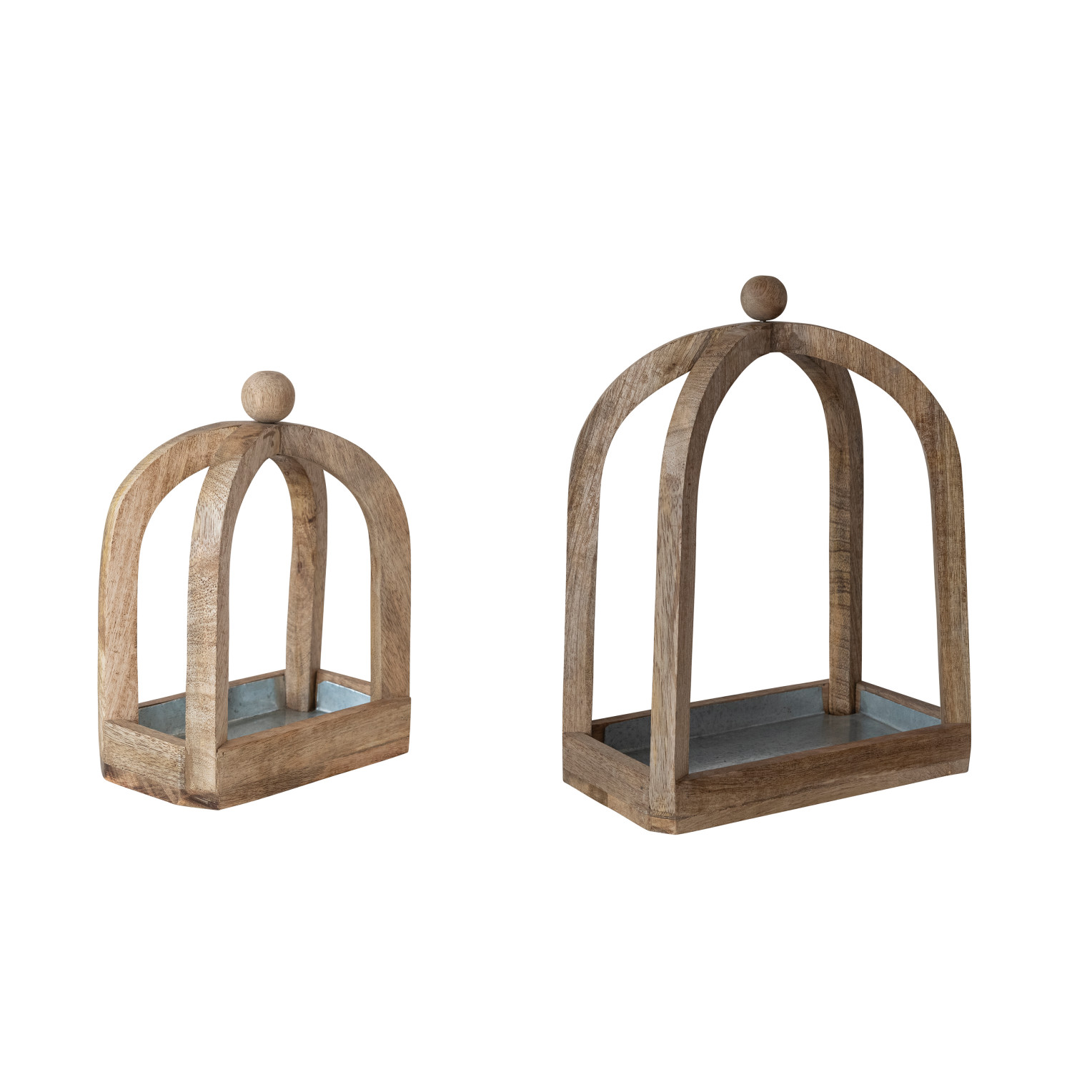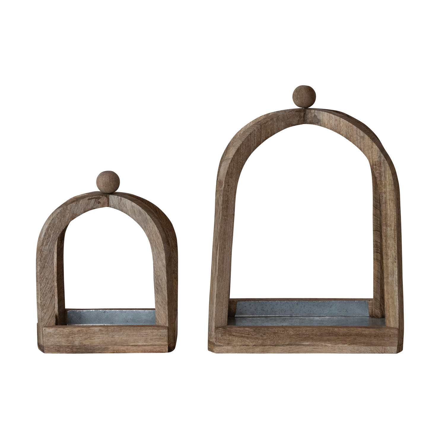 Mango Wood Arched Table Top Decor with Metal Lined Base & Knob Handles, Natural, Set of 2
