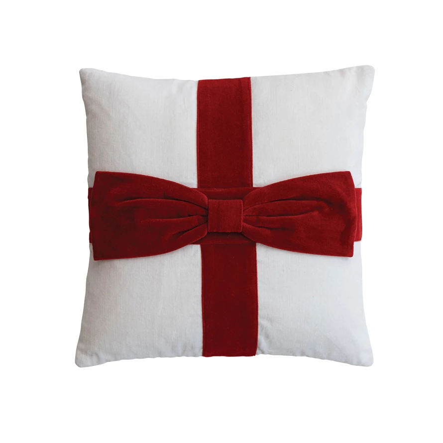 20" Square Cotton Velvet Pillow with Bow, White & Red