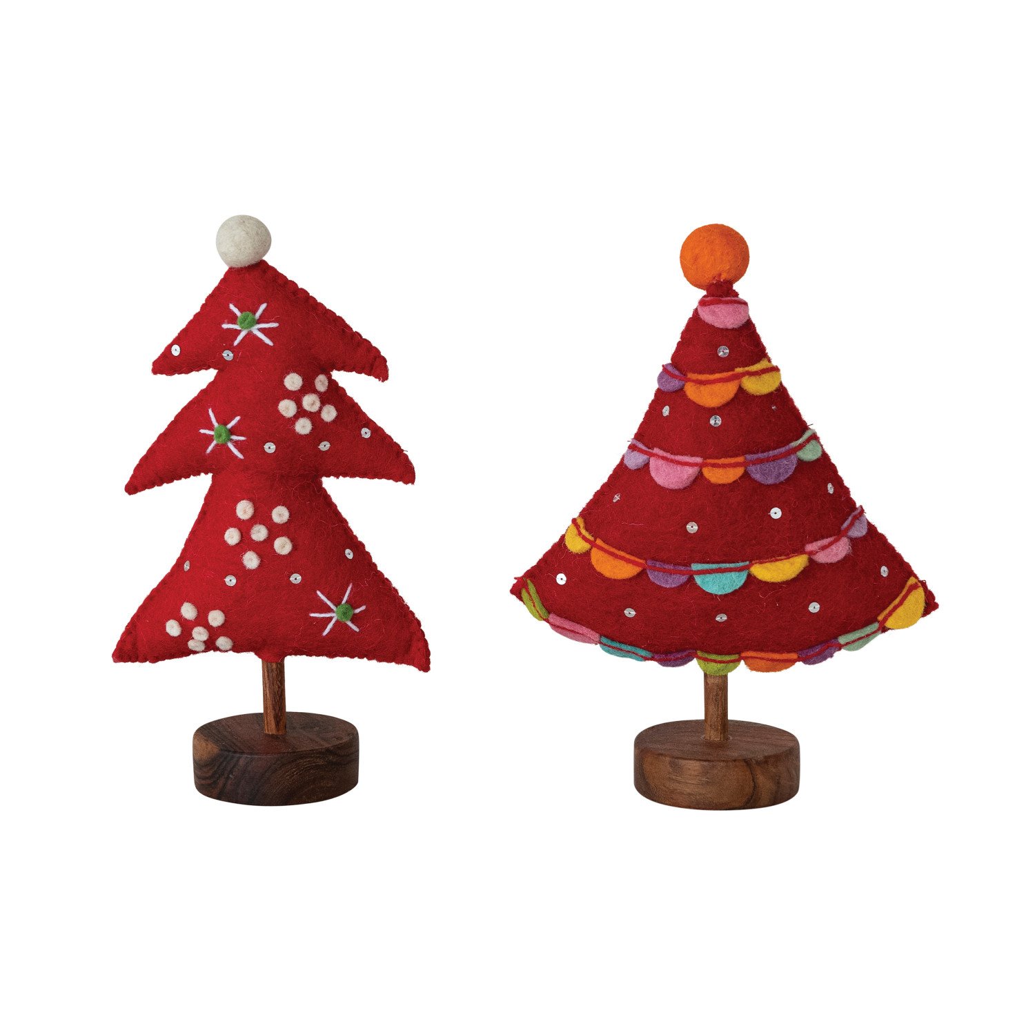Handmade Wool Felt Christmas Tree with Embroidery, Sequins, Pom Pom & Wood Base, 2 Styles