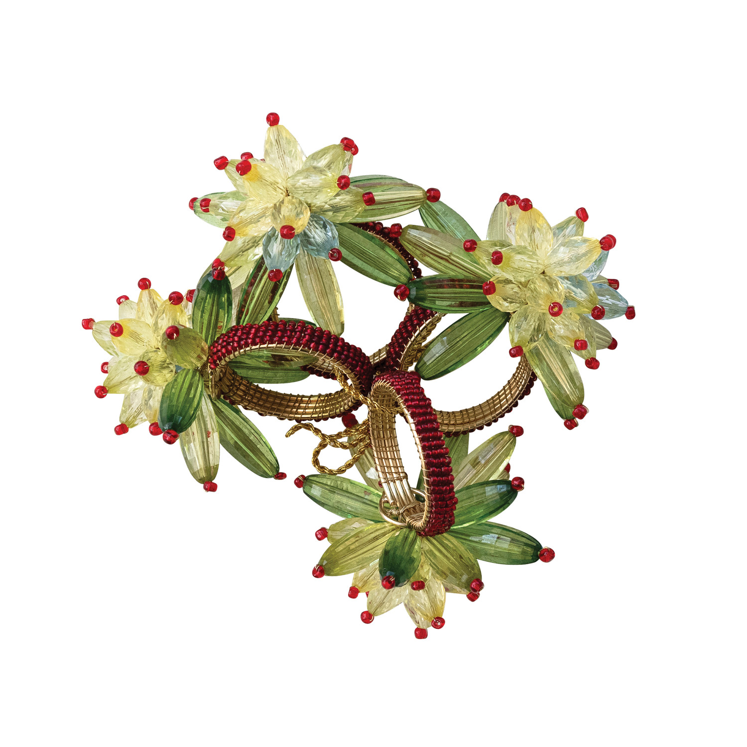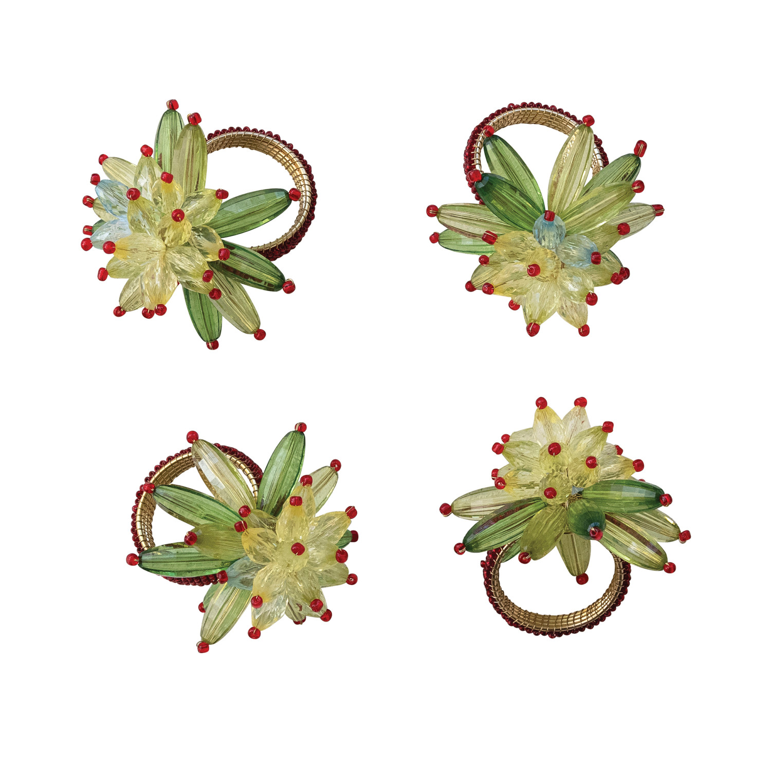 Catalog Name: 2" Round x 3"H Handmade Glass & Acrylic Beaded Metal Flower Napkin Rings, Green & Red, Set of 4 Tied w/ Gold Cord