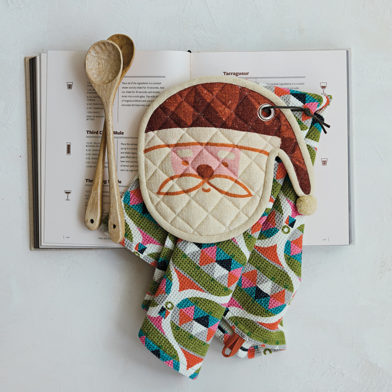 Catalog Name: 8"L x 8"H Cotton Quilted Santa Head Shaped Pot Holder w/ Pom Pom, Multi Color ©