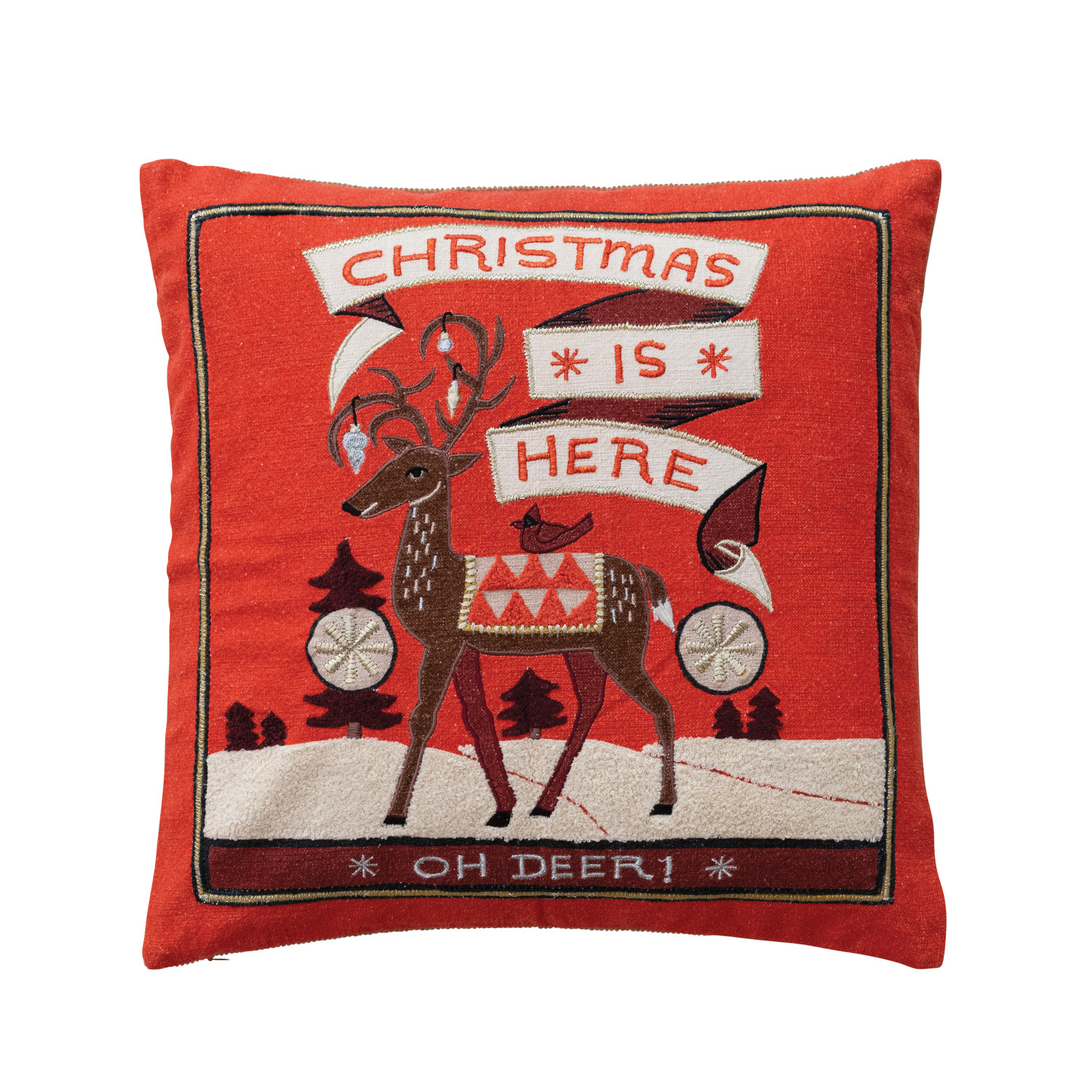 Catalog Name: 20" Square Cotton Slub Printed Pillow w/ Reindeer, Trees, Snowflakes, Embroidery & Corduroy Back "Christmas Is Here…", Multi Color ©