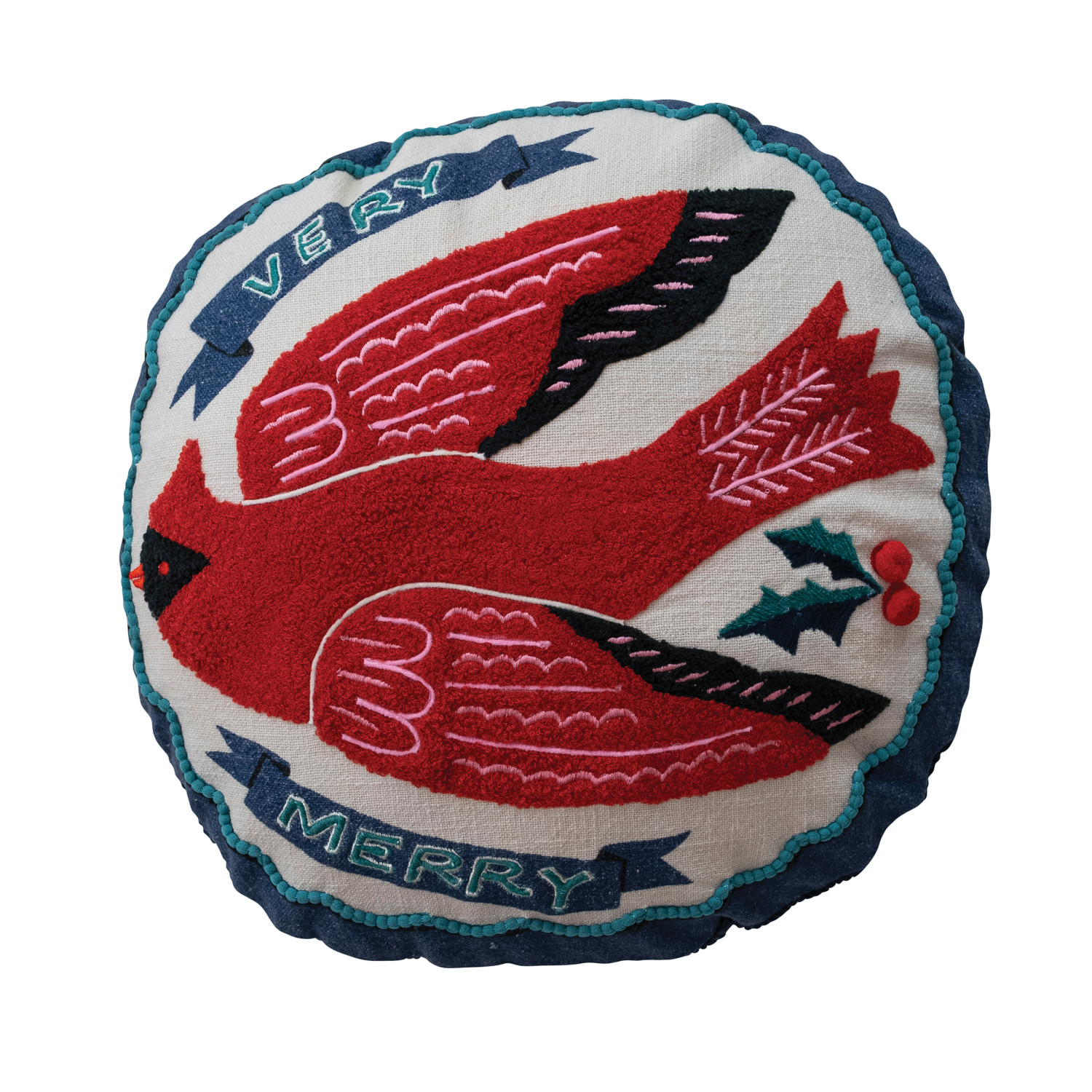 Catalog Name: 16" Round Cotton Slub Printed Pillow w/ Cardinal, Holly Berries, Embroidery & Corduroy Back "Very Merry", Multi Color ©