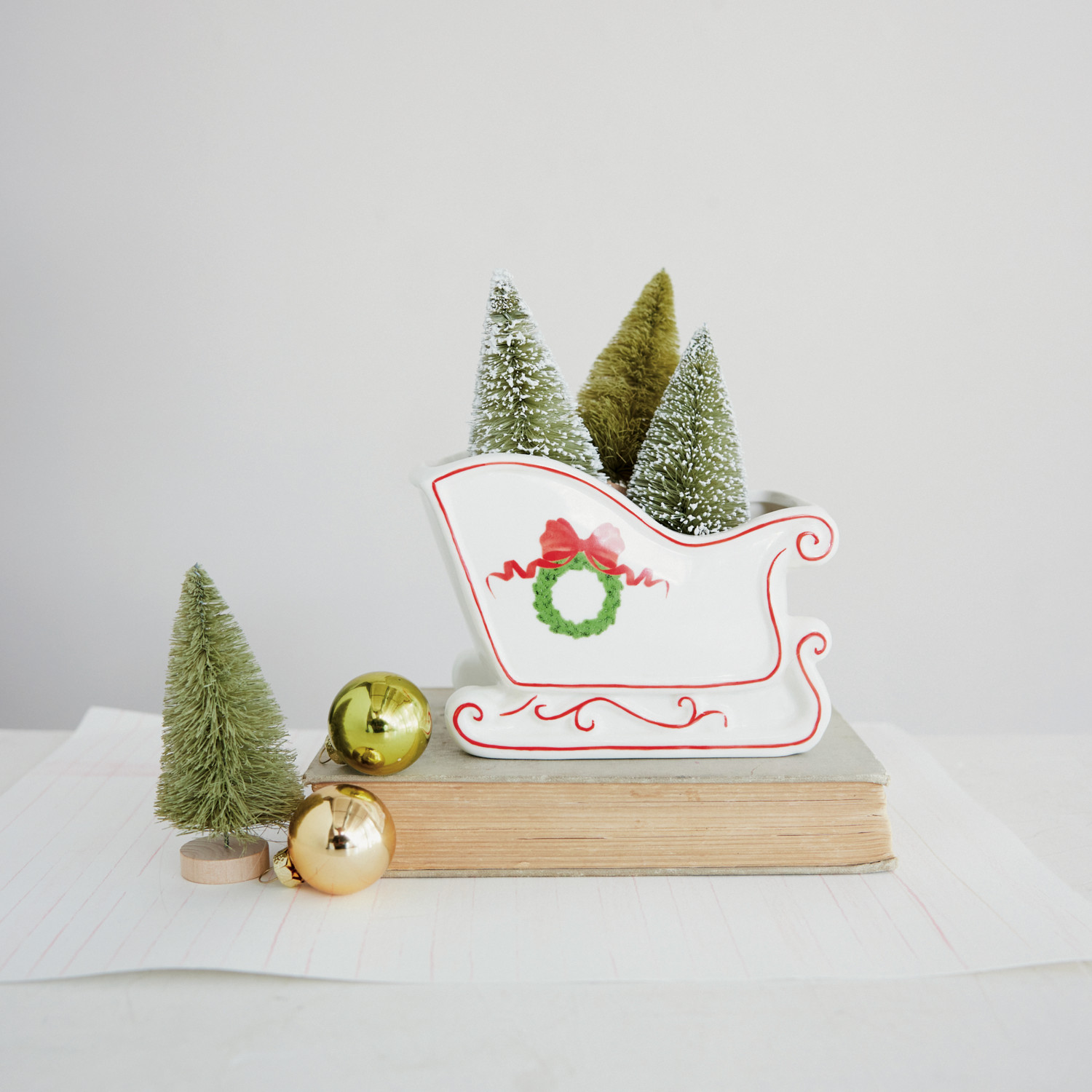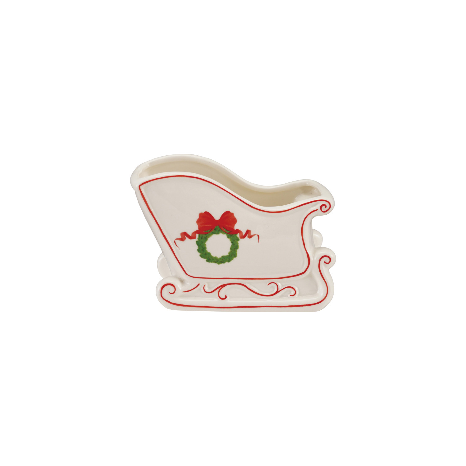 Catalog Name: 5"L x 3"W x 3-1/2"H Stoneware Sled Shaped Container w/ Wreath & Bow, White, Red & Green