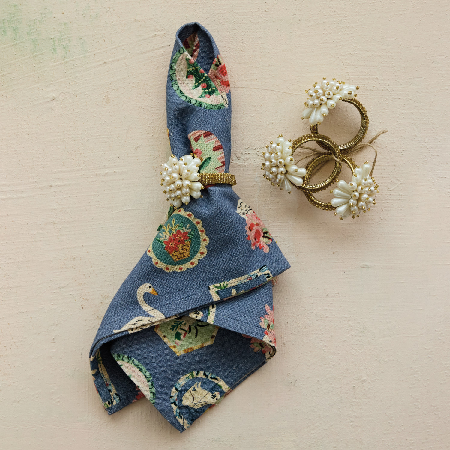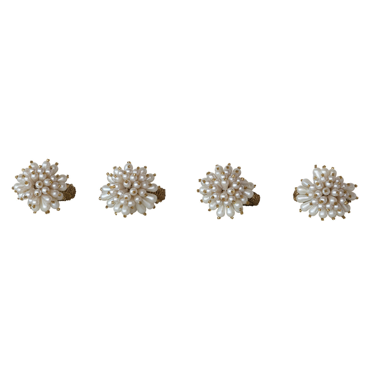 Glass Beaded Metal Napkin Rings with Faux Pearl Clusters, Set of 4 Tied with Jute