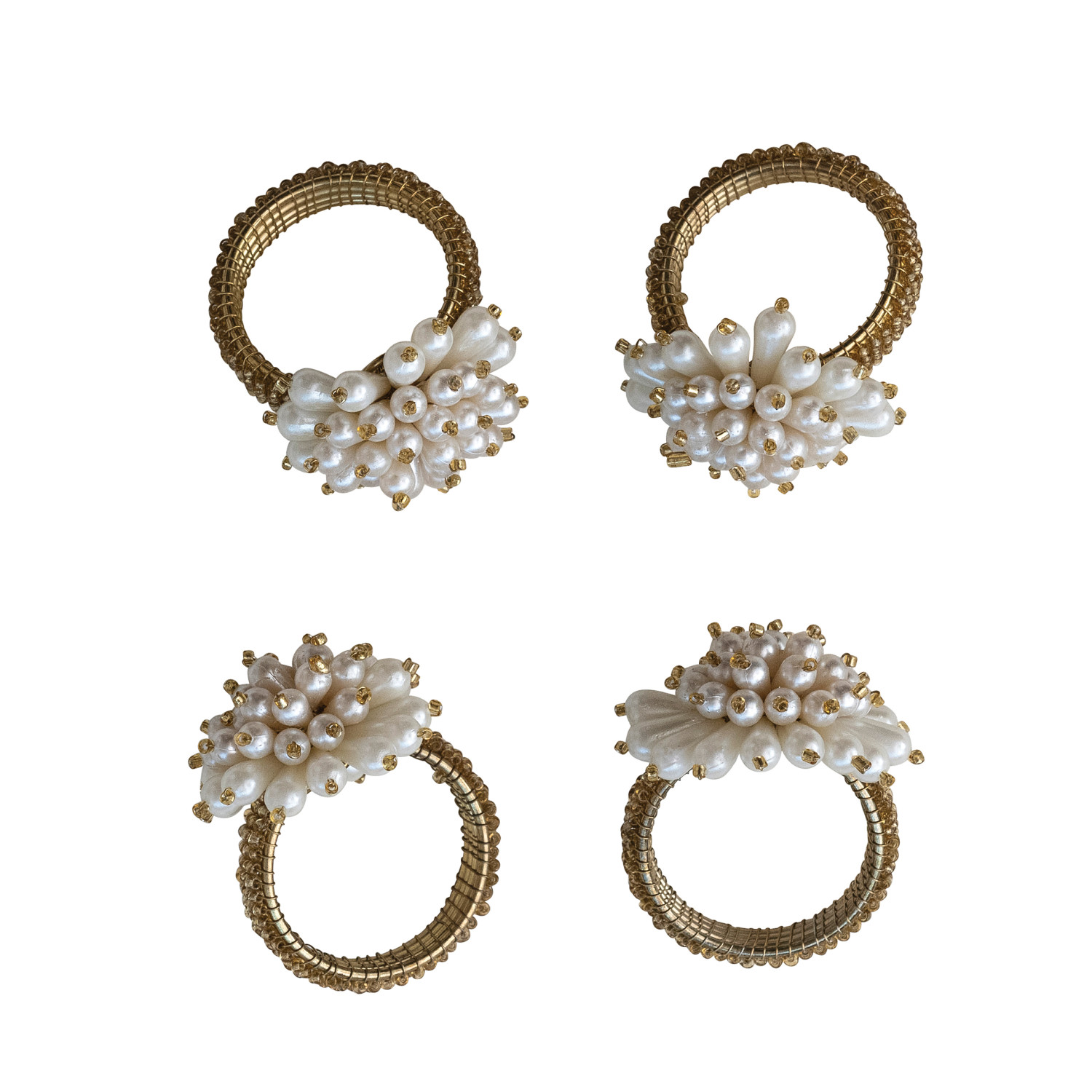 Catalog Name: 1-3/4" Round x 2-1/2"H Glass Beaded Metal Napkin Rings w/ Faux Pearl Clusters, Gold Finish, Set of 4 Tied w/ Jute