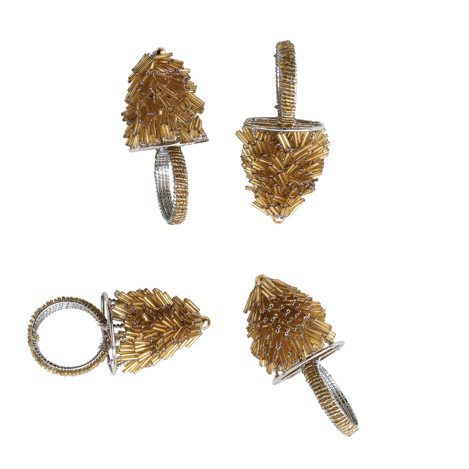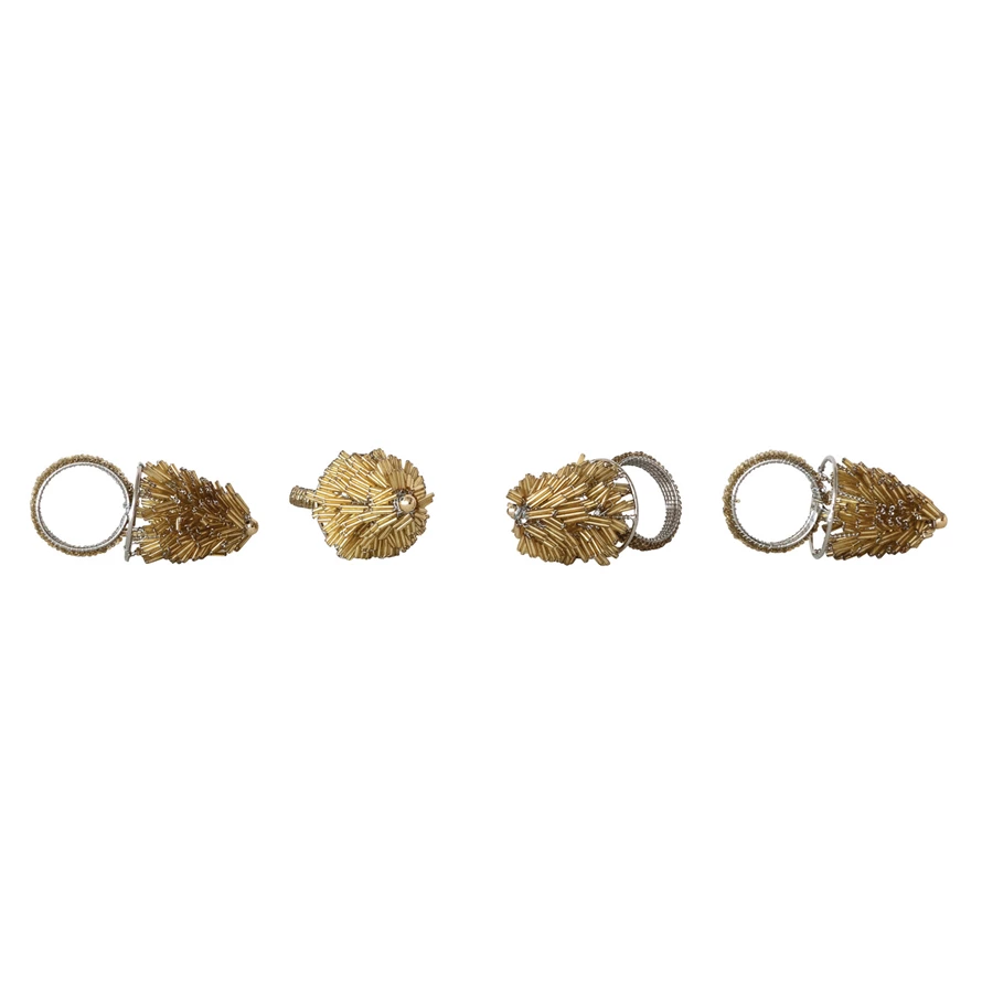 Catalog Name: 2" Round x 4"H Handmade Metal & Glass Beaded Tree Napkin Rings, Gold Finish, Set of 4 Tied w/ Jute
