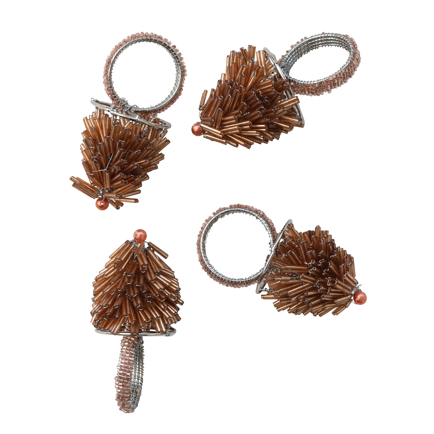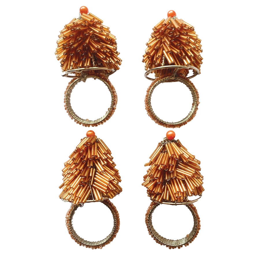 Catalog Name: 2" Round x 4"H Handmade Metal & Glass Beaded Tree Napkin Rings, Copper Finish, Set of 4 Tied w/ Jute