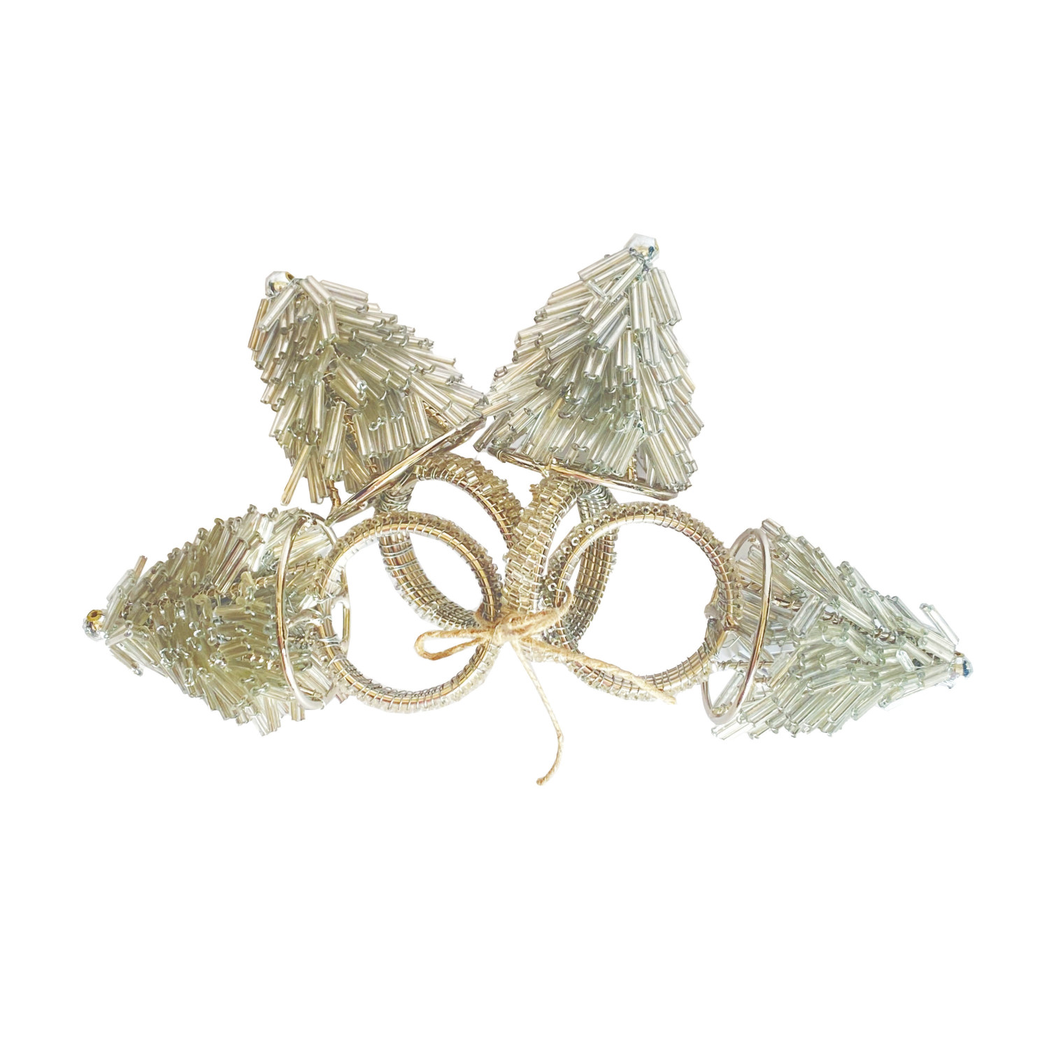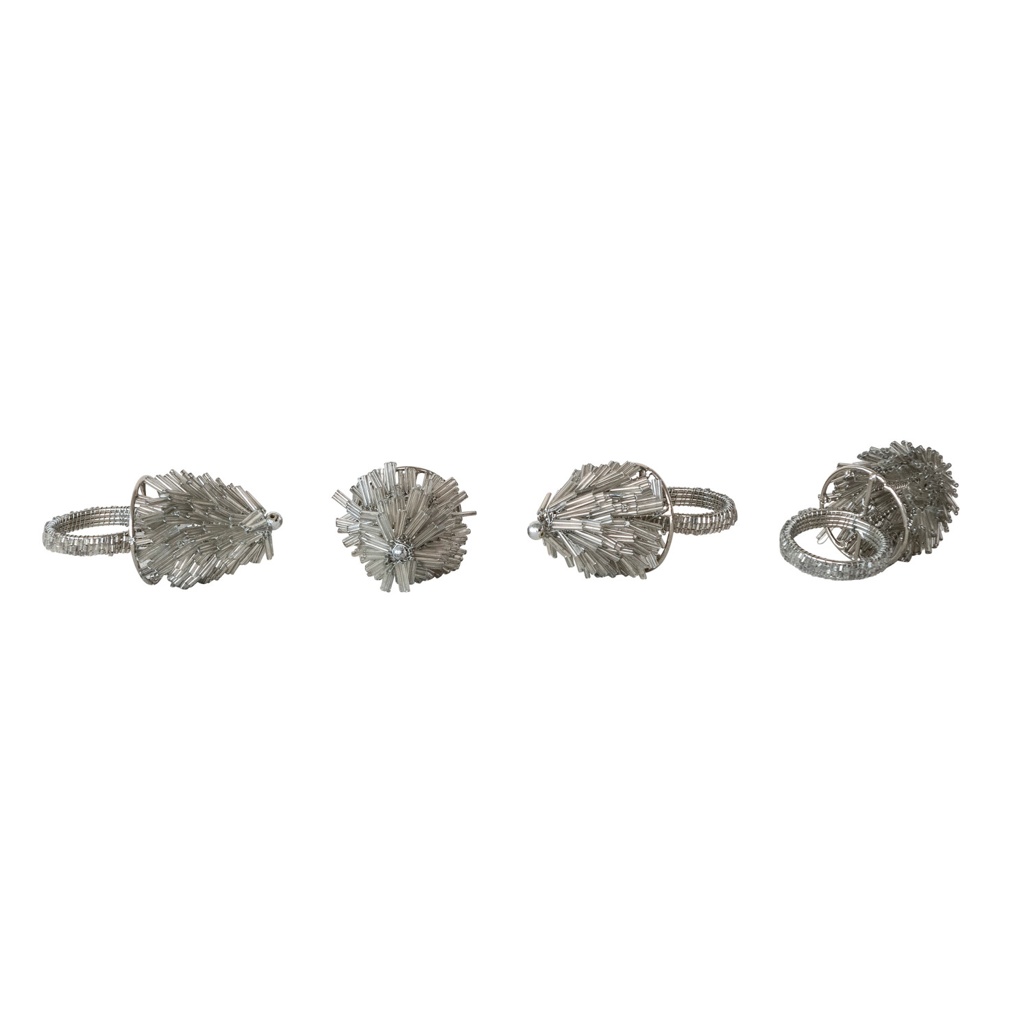 Catalog Name: 2" Round x 4"H Handmade Metal & Glass Beaded Tree Napkin Rings, Silver Finish, Set of 4 Tied w/ Jute