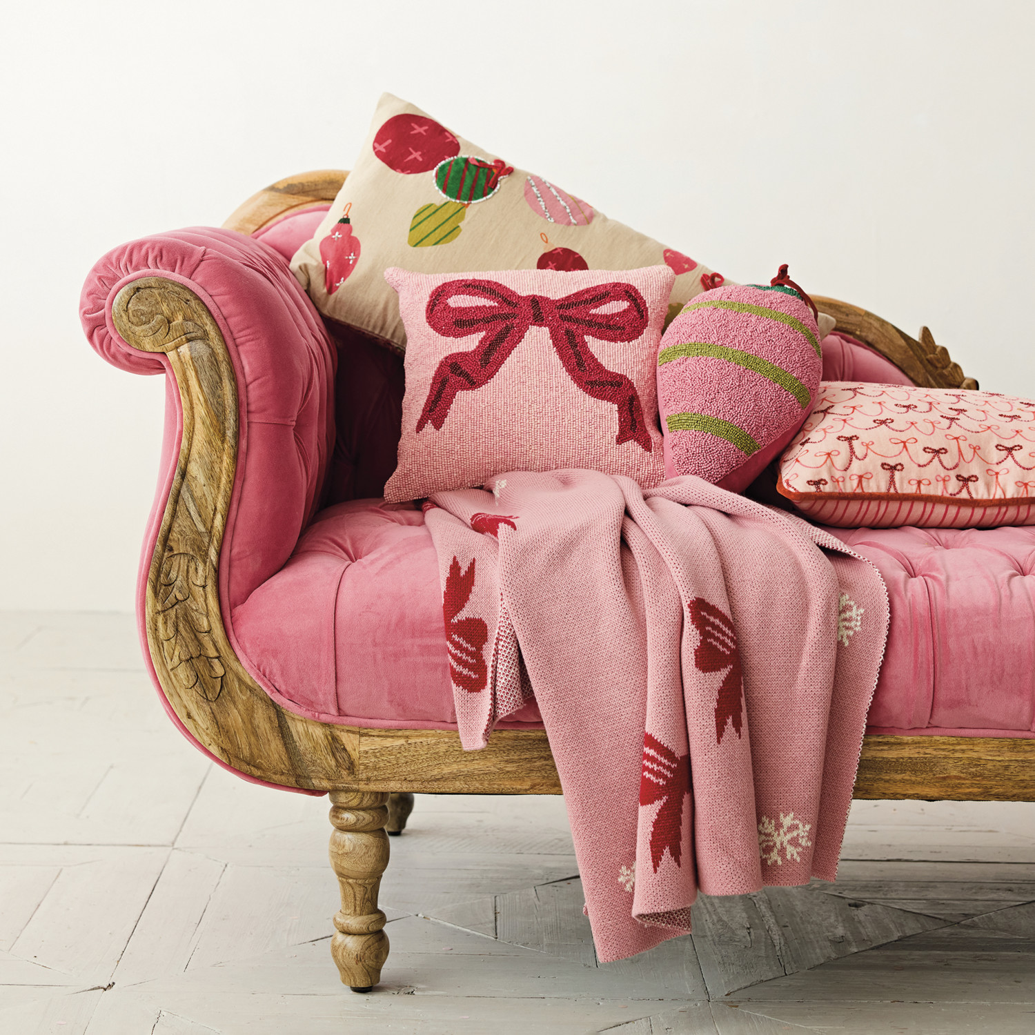 Catalog Name: 20"L x 14"H Cotton Velvet Printed Lumbar Pillow w/ Bow Pattern, Piping, Beads & Striped Back, Cream Color, Red & Pink ©