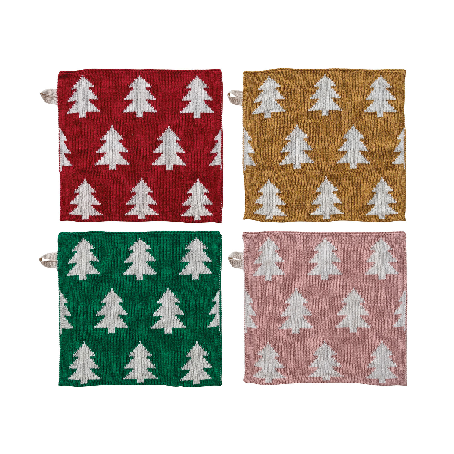 Cotton Knit Dish Cloth with Tree Pattern, 4 Colors