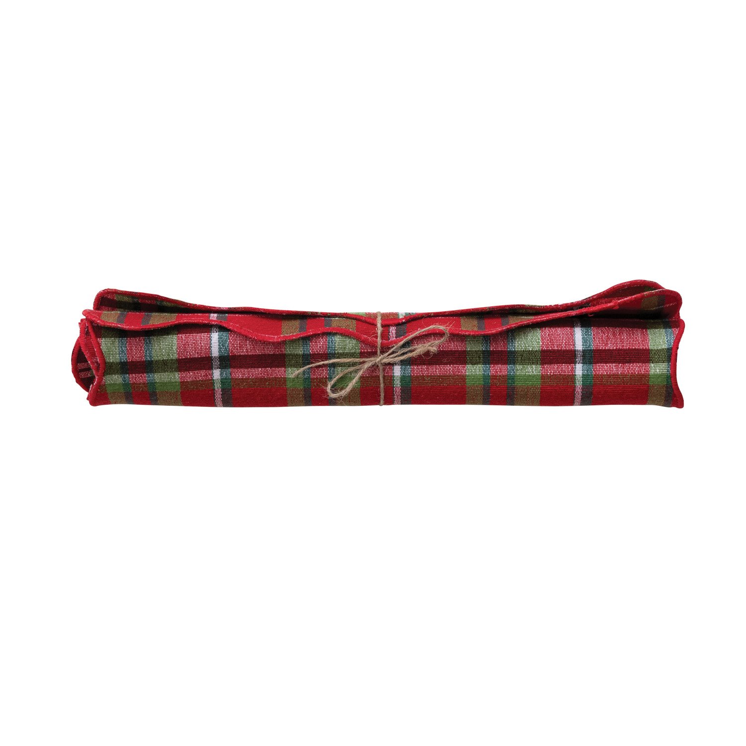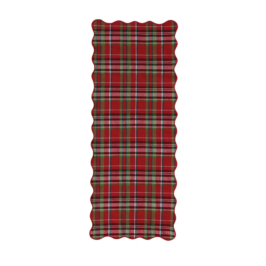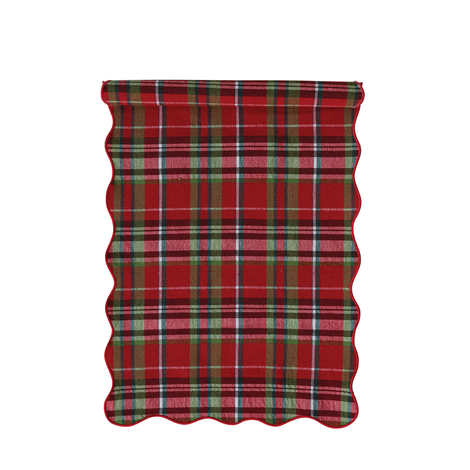 Catalog Name: 36"L x 14"W Cotton Scalloped Table Runner w/ Tartan Plaid Pattern & Stitched Edge, Multi Color, Roll Tied w/ Green Cotton Tape