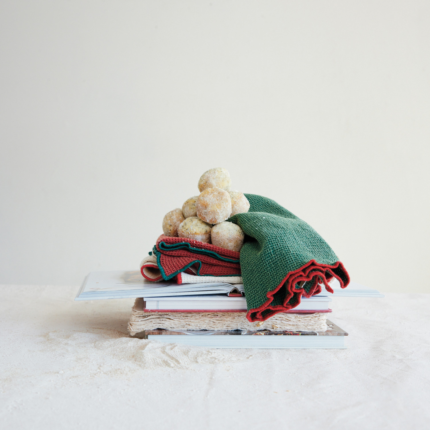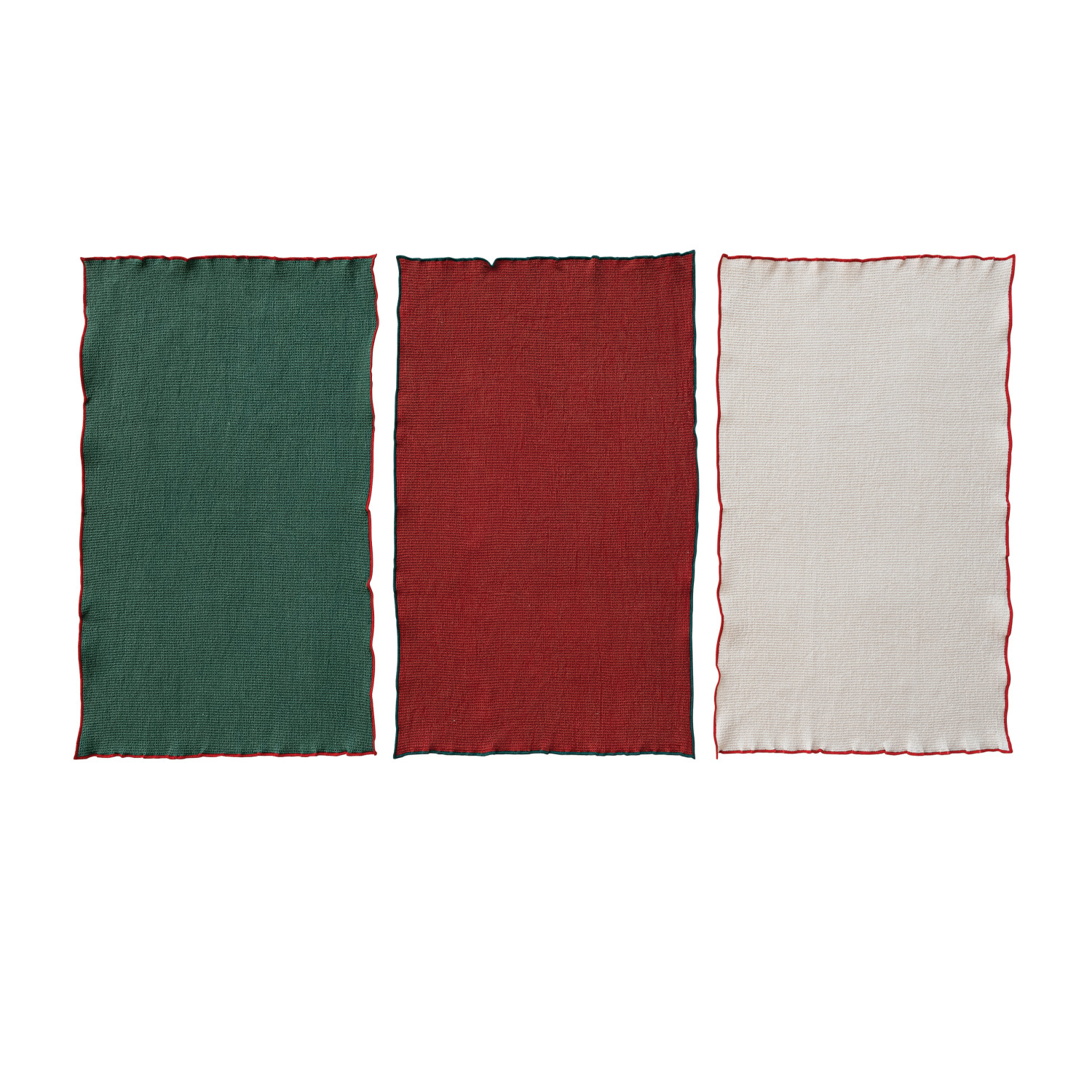 Catalog Name: 28"L x 18"W Cotton Waffle Weave Tea Towel w/ Colored Stitched Edge, Natural, Green & Red, 3 Styles