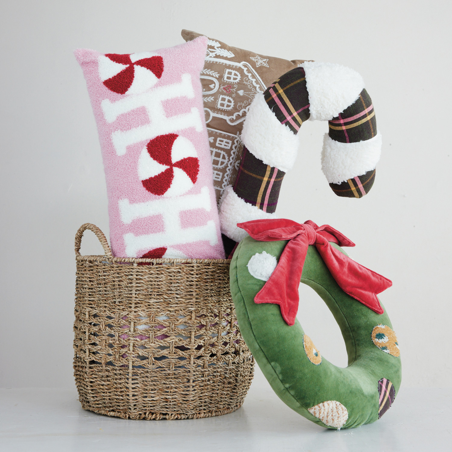 Cotton Velvet Lumbar Pillow with Embroidered Gingerbread Scene, Brown & White