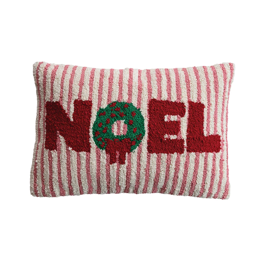 Woven Cotton Striped Lumbar Pillow with Tufted Wreath & "Noel"