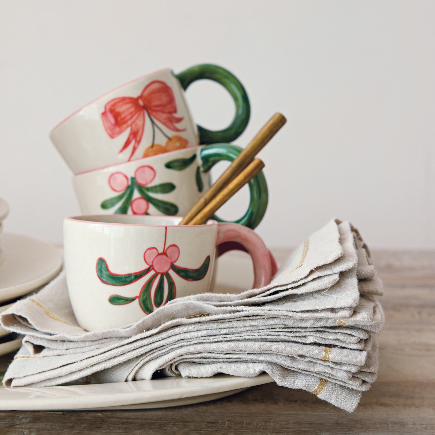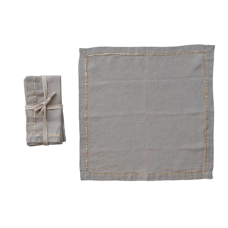 Linen Napkins with Metallic Gold Thread Embroidered Border, Set of 4 Tied with Cotton Tape