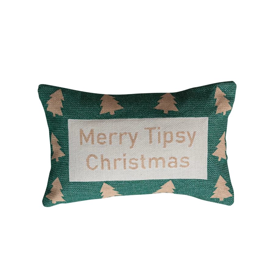 Cotton Embroidered Lumbar Pillow with Tree Pattern "Merry Tipsy Christmas"