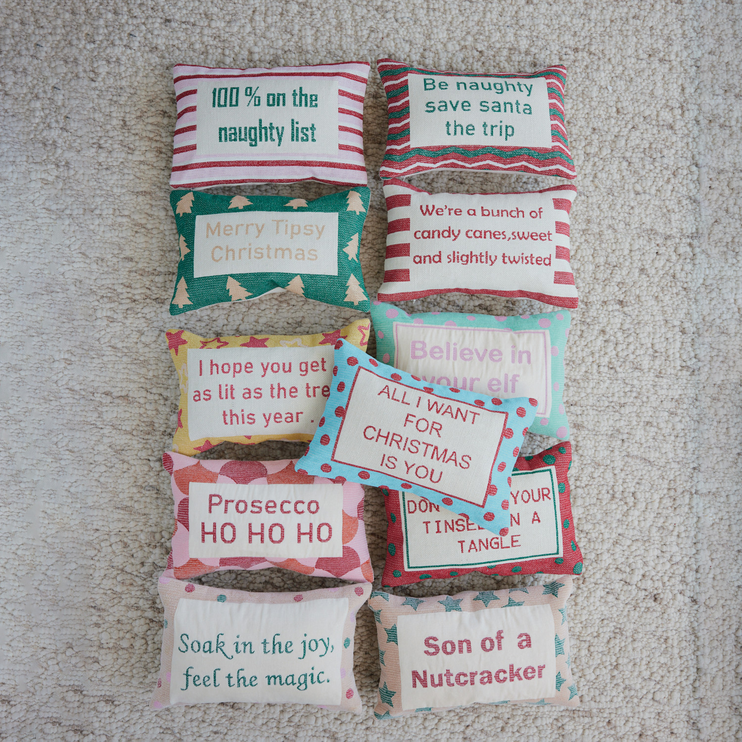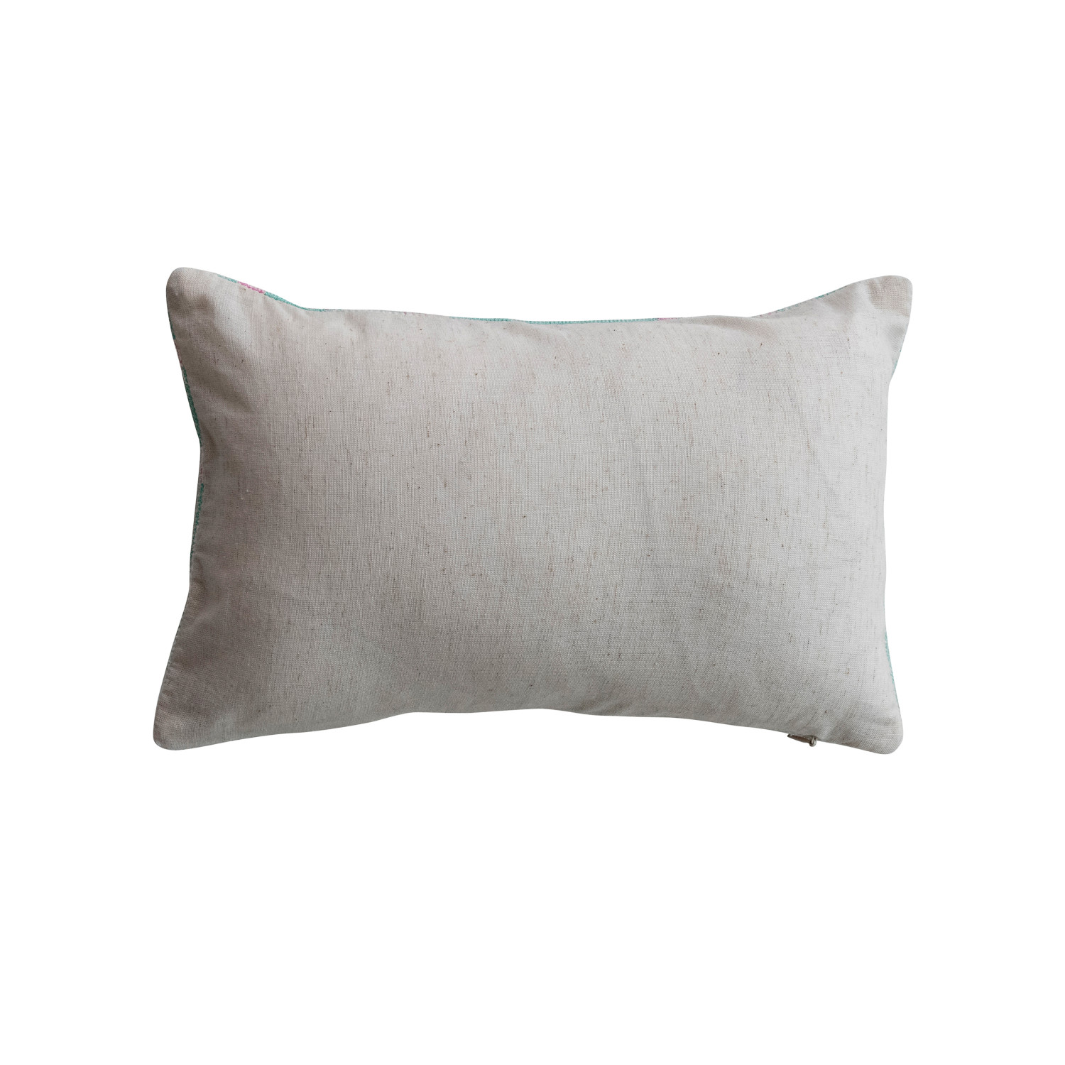 Catalog Name: 14"L x 9"H Cotton & Velvet Embroidered Lumbar Pillow w/ Polka Dot Pattern "Believe In Your Elf", Mint Color, Pink & Natural