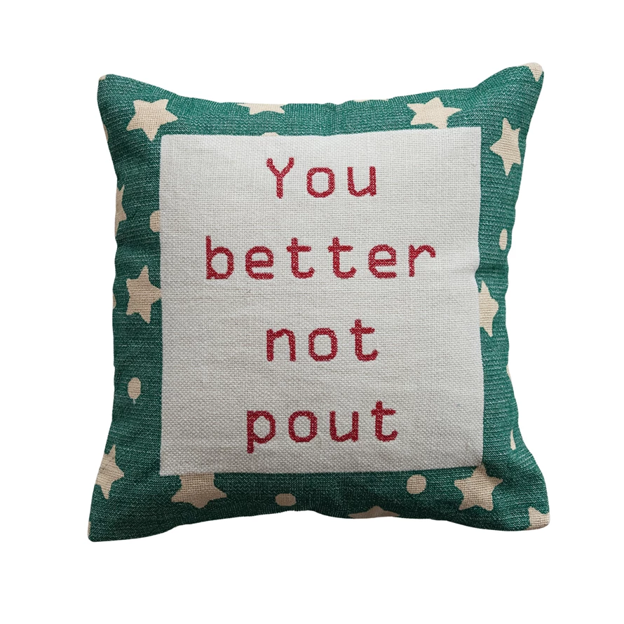 16" Square Cotton Embroidered Pillow with Star Pattern "You Better Not Pout"