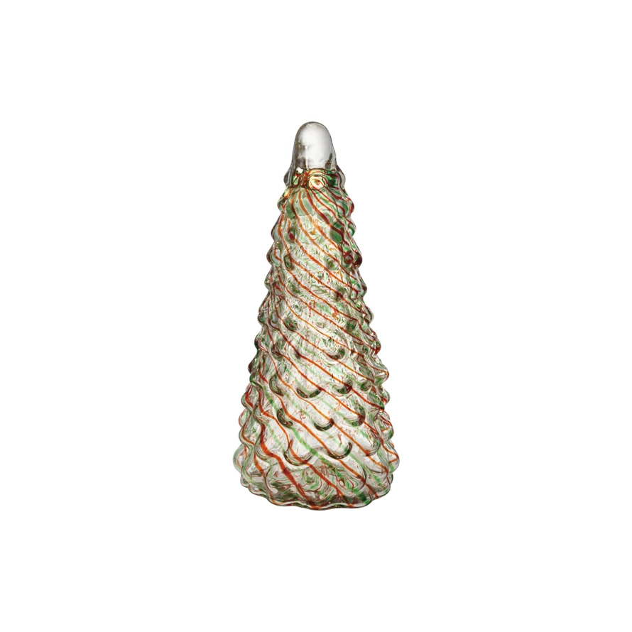 Catalog Name: 4" Round x 9"H Hand-Blown Art Glass Tree w/ Candy Stripes, Red & Green