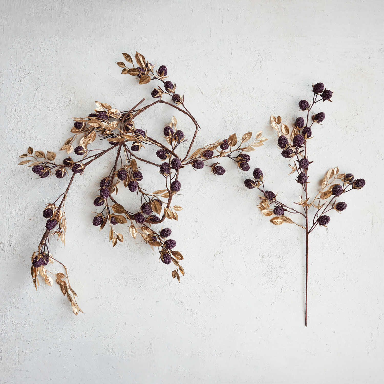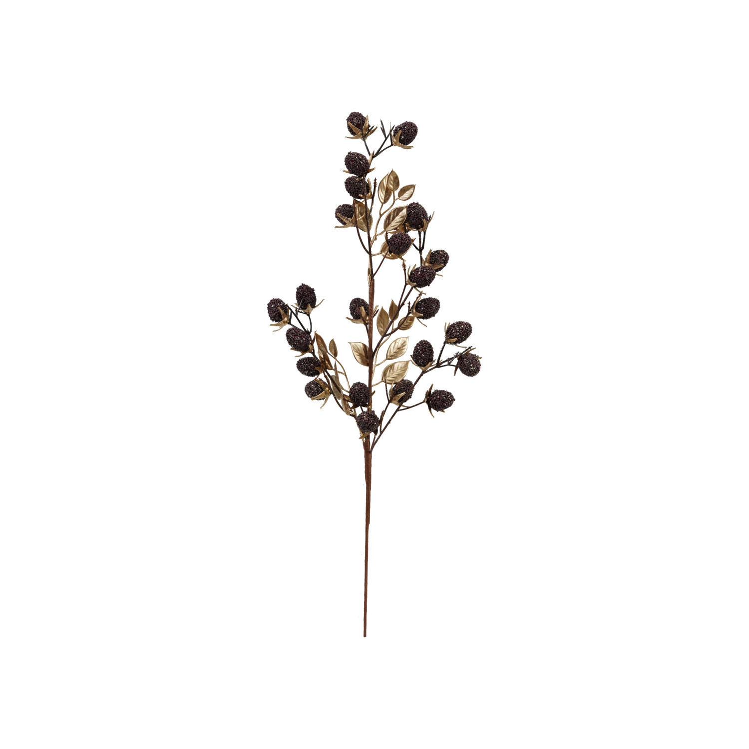 Catalog Name: 23-1/2"H Faux Berry & Leaves Stem w/ Glitter, Gold Finish & Burgundy