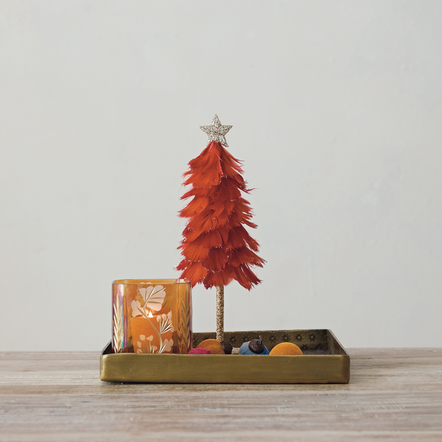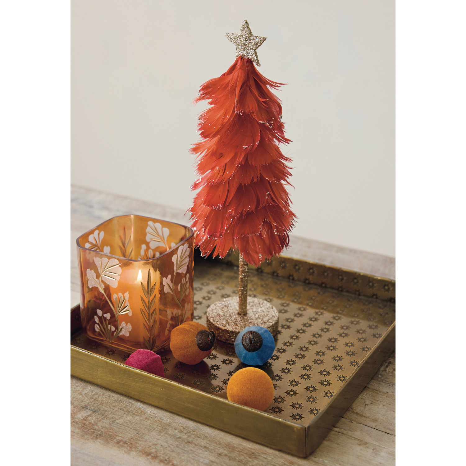 Feather Tree with Star, Glitter & Wood Base, Gold Finish & Pink