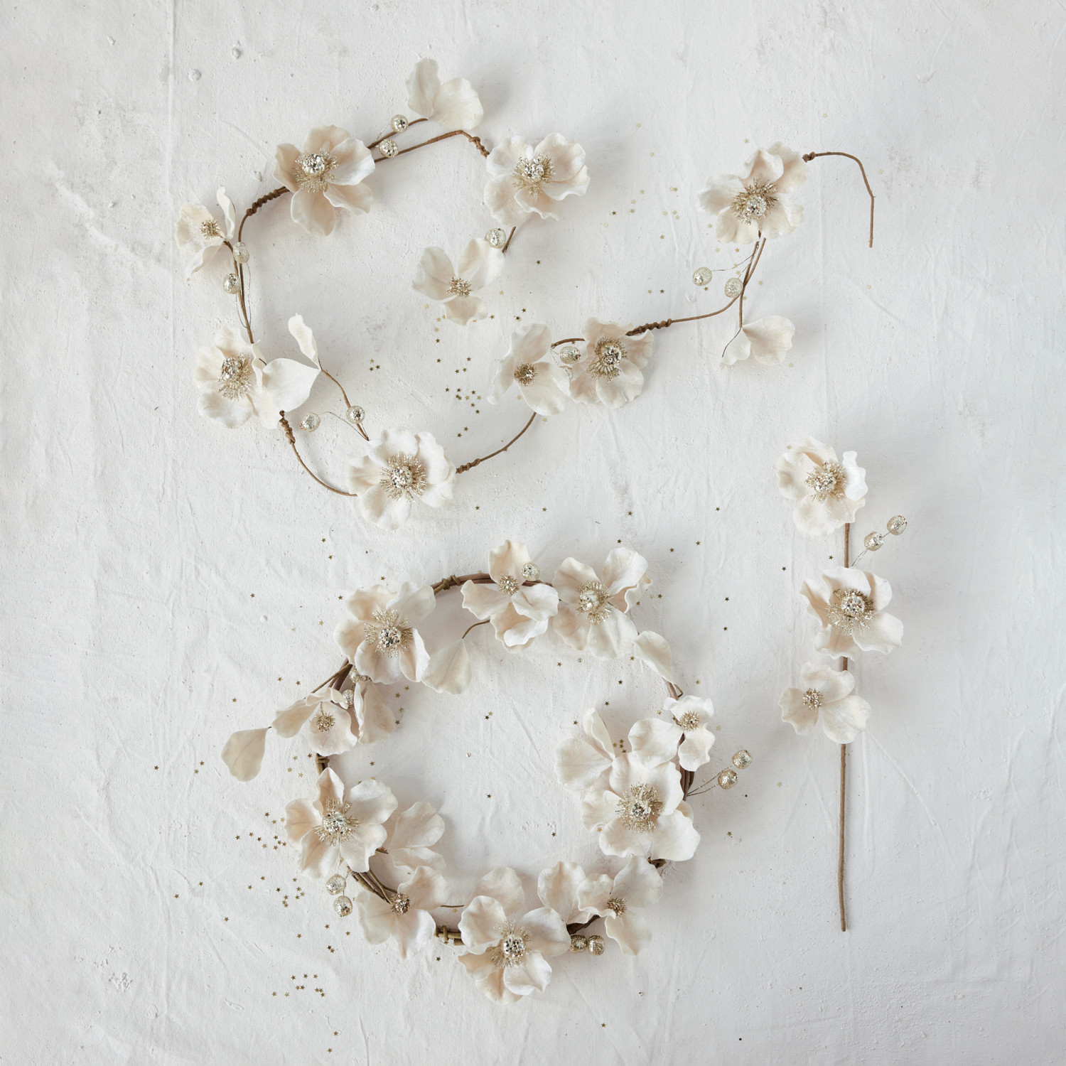 Faux Magnolia Flower Garland with Glitter & Jewels, Blush Color