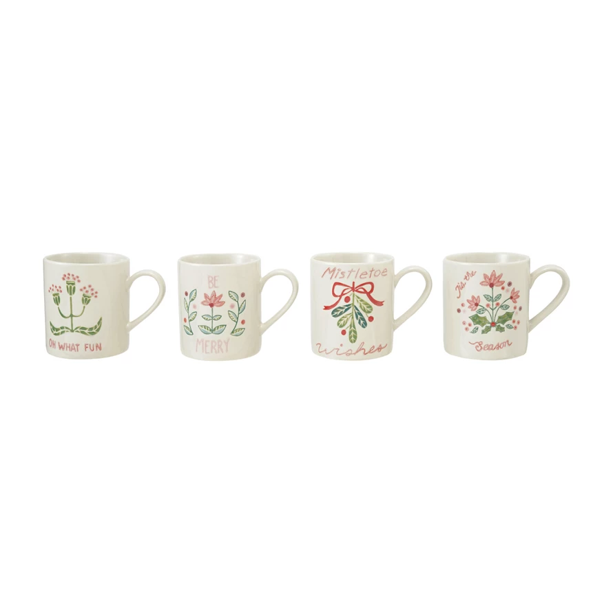 14 oz. Hand-Painted Stoneware Mug with Wax Relief Holiday Botanicals & Saying, 4 Styles ©