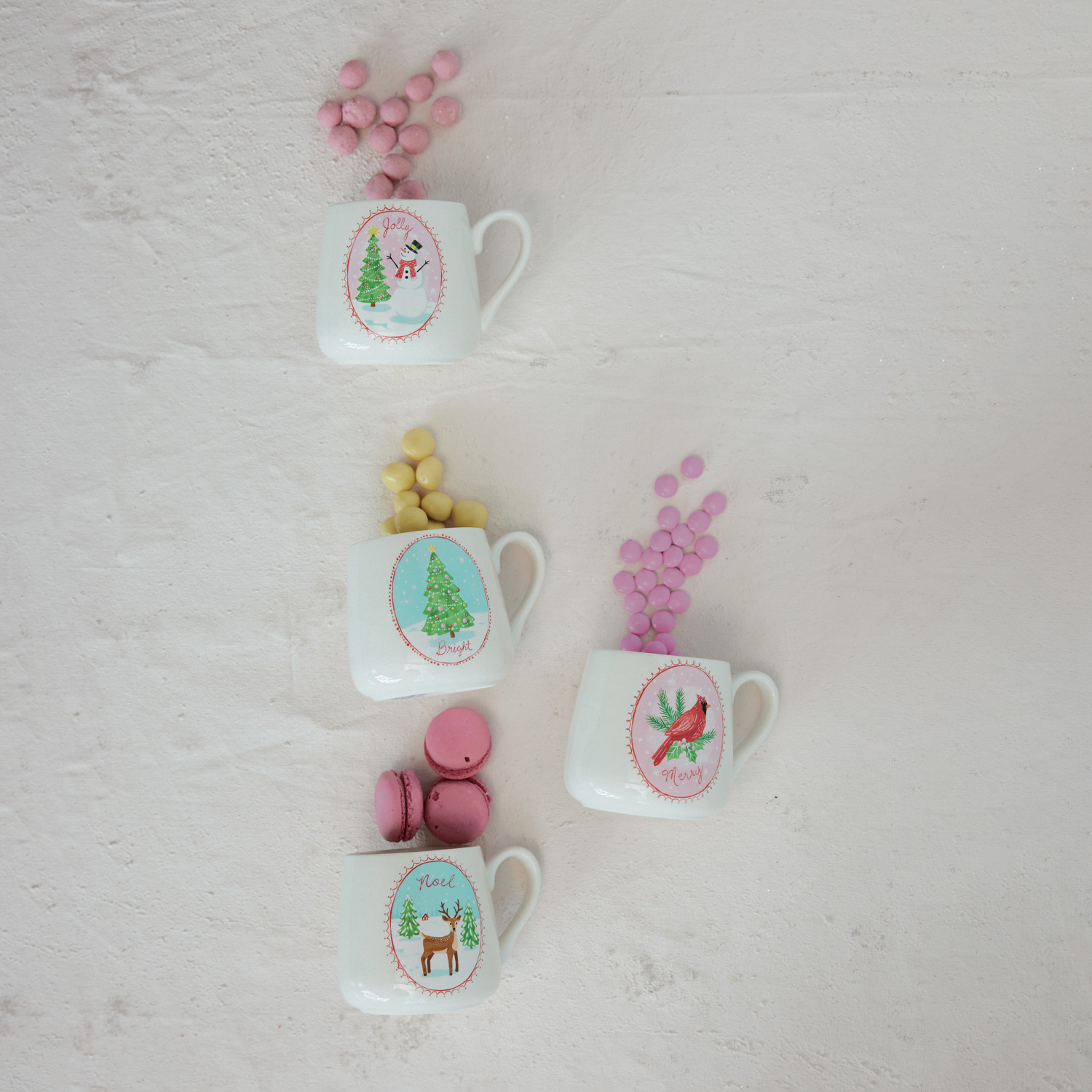 Catalog Name: 3" Round x 3-1/2"H 14 oz. Stoneware Mug w/ Holiday Image & Word, Multi Color, 4 Styles ©