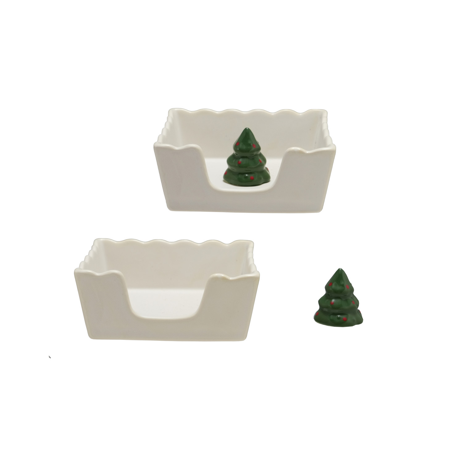 Catalog Name: 6" Square x 2"H Hand-Painted Stoneware Scalloped Cocktail Napkin Holder w/ Tree Shaped Weight, White, Green & Red, Set of 2 (Holds 4" Square Napkin)