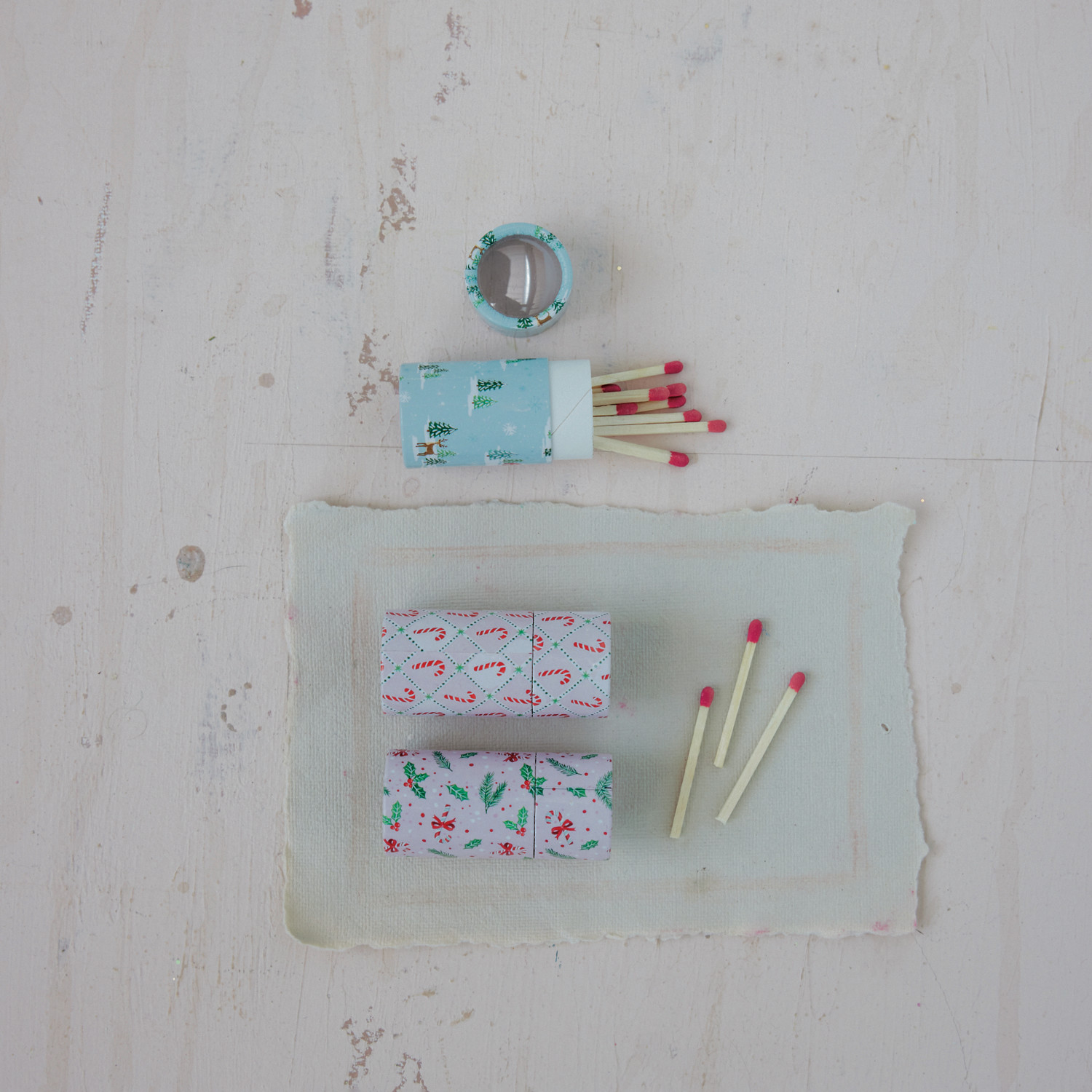 Safety Matches in Tube Matchbox with Holiday Pattern, 3 Styles ©