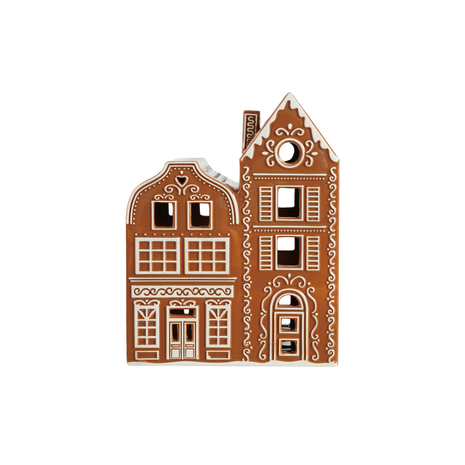 Catalog Name: 4-1/2"L x 4"W x 9-1/2"H Hand-Painted Ceramic Gingerbread House w/ Embossed Design, Brown & White