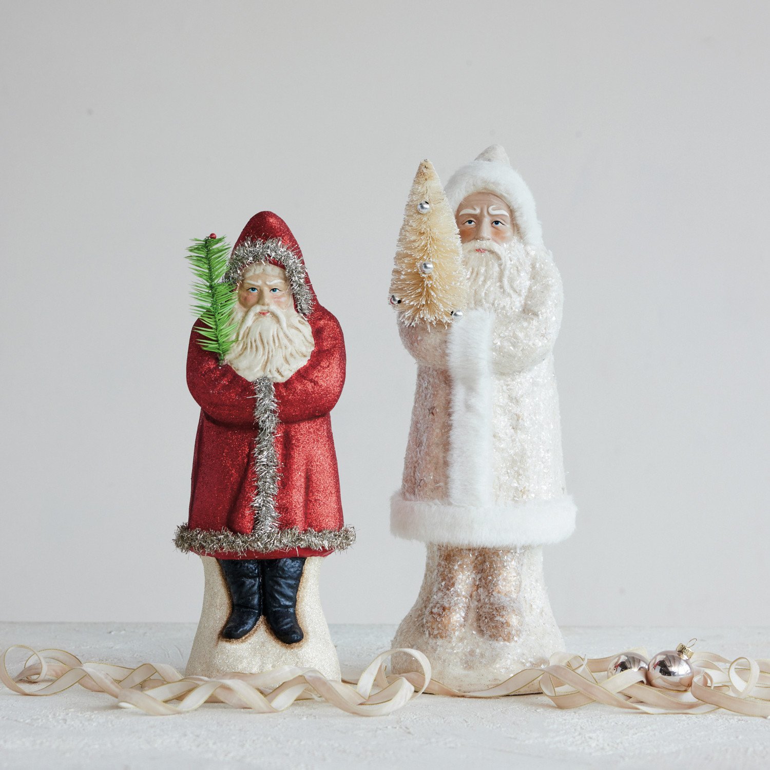 Catalog Name: 6"L x 5-1/2"W x 16-1/2"H Paper Mache Vintage Reproduction Belsnickel w/ Bottle Brush Tree & Mica Flakes, Multi Color