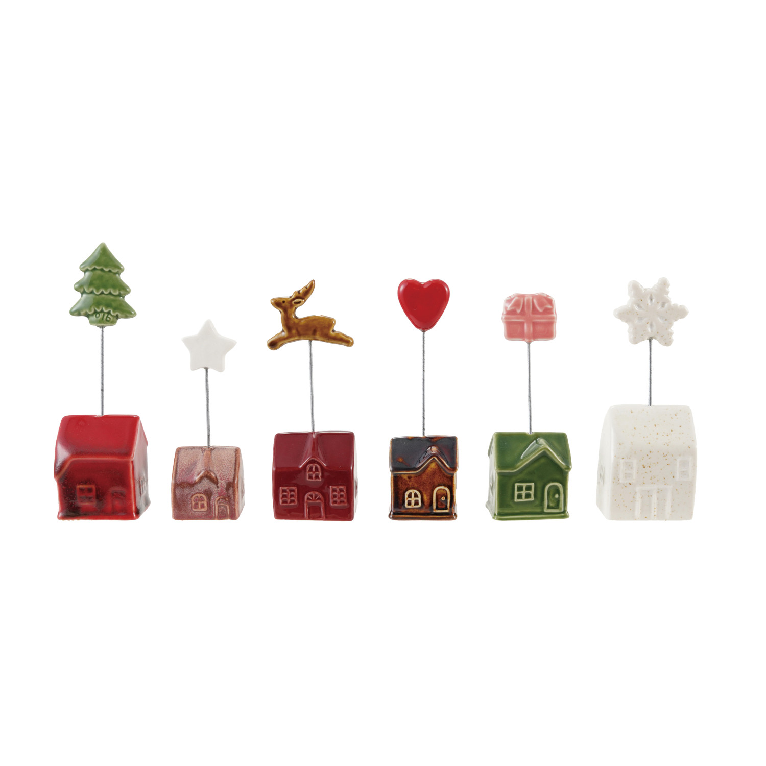 Catalog Name: 2"W x 5-3/4"H Stoneware House w/ Icon, Reactive Glaze, Multi Color, 6 Styles (Each One Will Vary)
