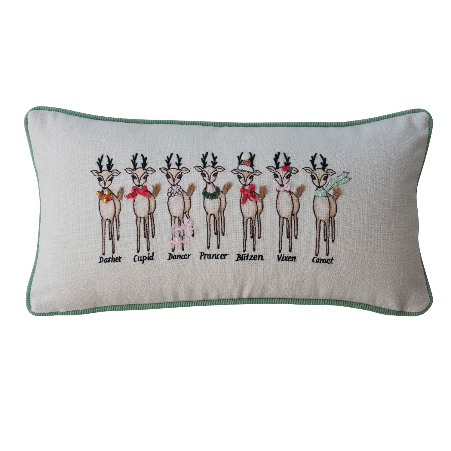 Catalog Name: 24"L x 12"H Cotton Slub Printed Lumbar Pillow w/ Santa's Reindeer, Embroidery, Piping & Velvet Back "Dasher, Cupid, Dancer…", Multi Color ©