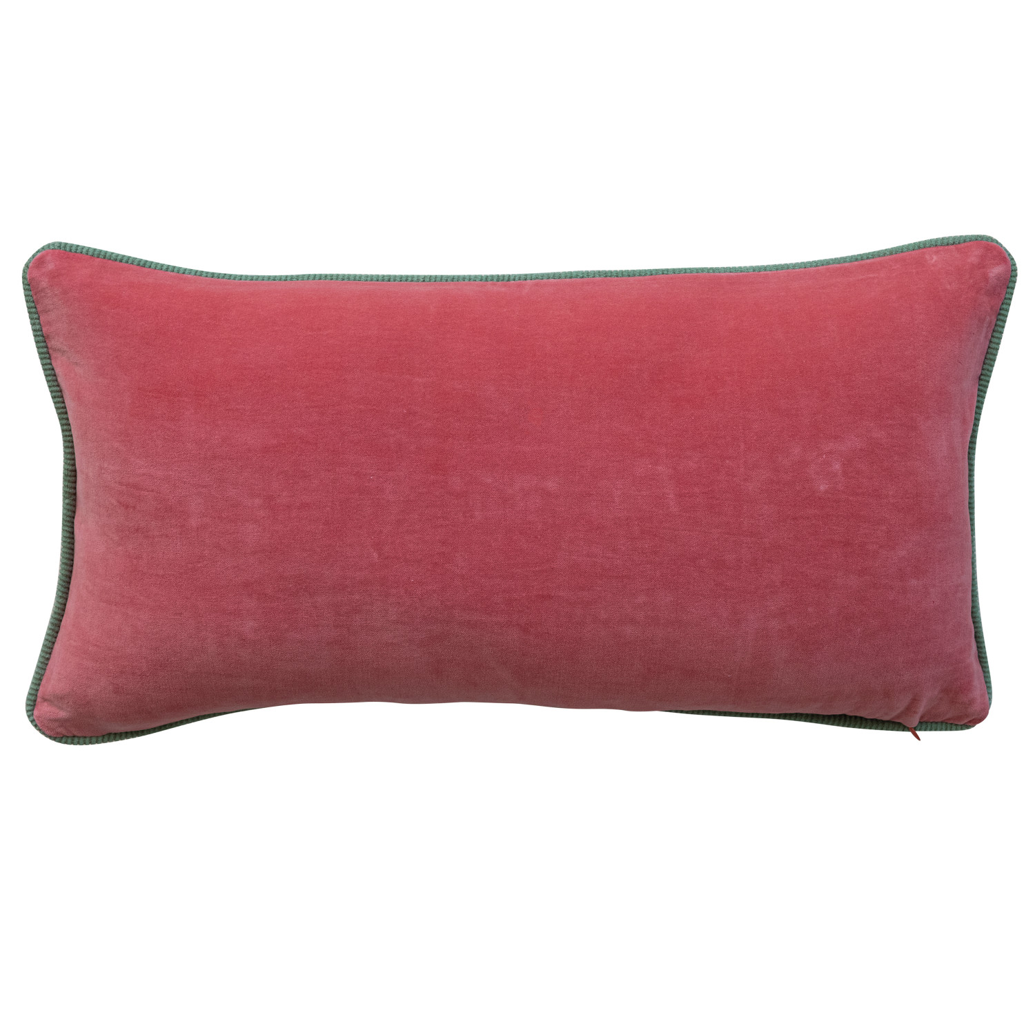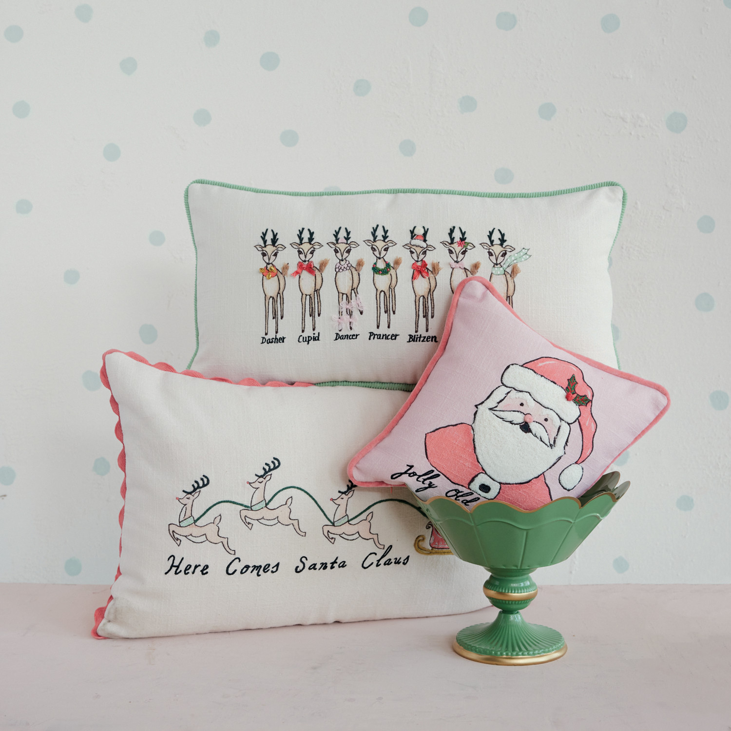 Cotton Slub Printed Lumbar Pillow with Santa's Reindeer, Embroidery, Piping & Velvet Back ©