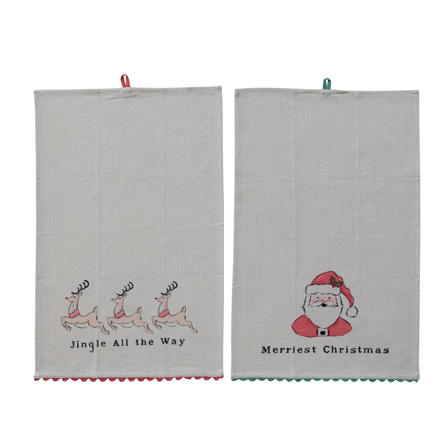 Catalog Name: 28"L x 18"W Cotton Slub Printed Tea Towel w/ Reindeer/Santa, Saying & Ric Rac Trim, Multi Color, 2 Styles ©