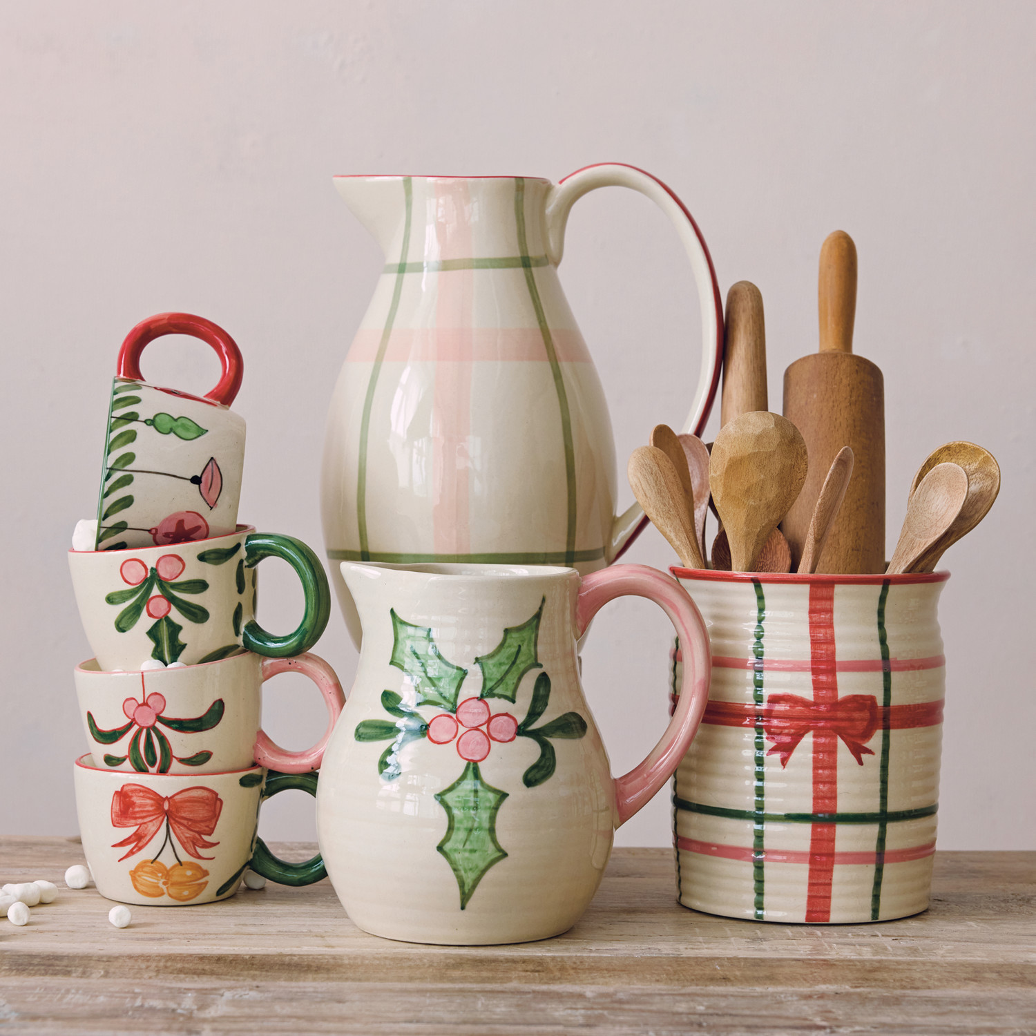 Catalog Name: 3-3/4" Round x 2-3/4"H 8 oz. Hand-Painted Stoneware Mug w/ Holiday Botanicals/Images, Colored Rim & Handle, Multi Color, 4 Styles (Each One Will Vary)