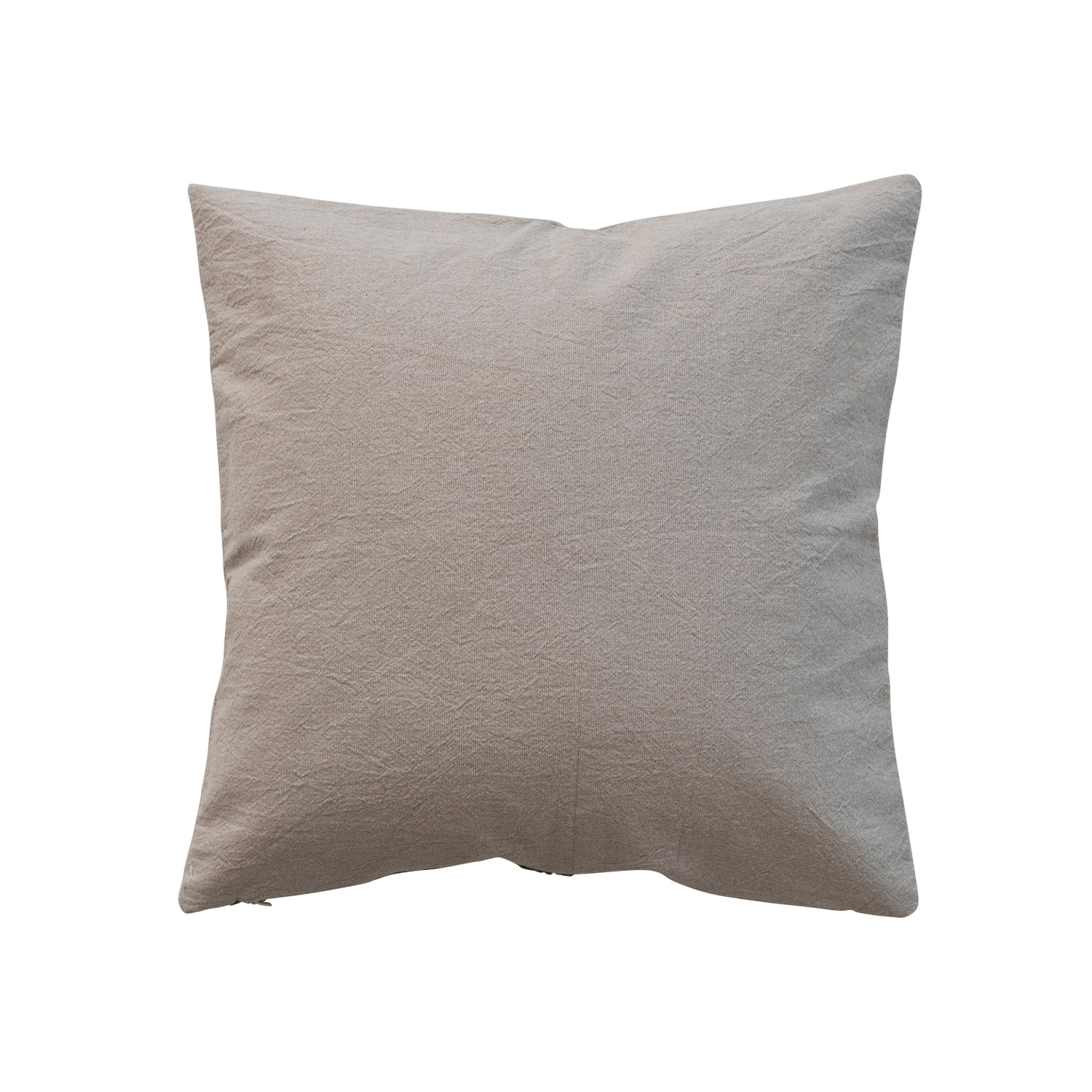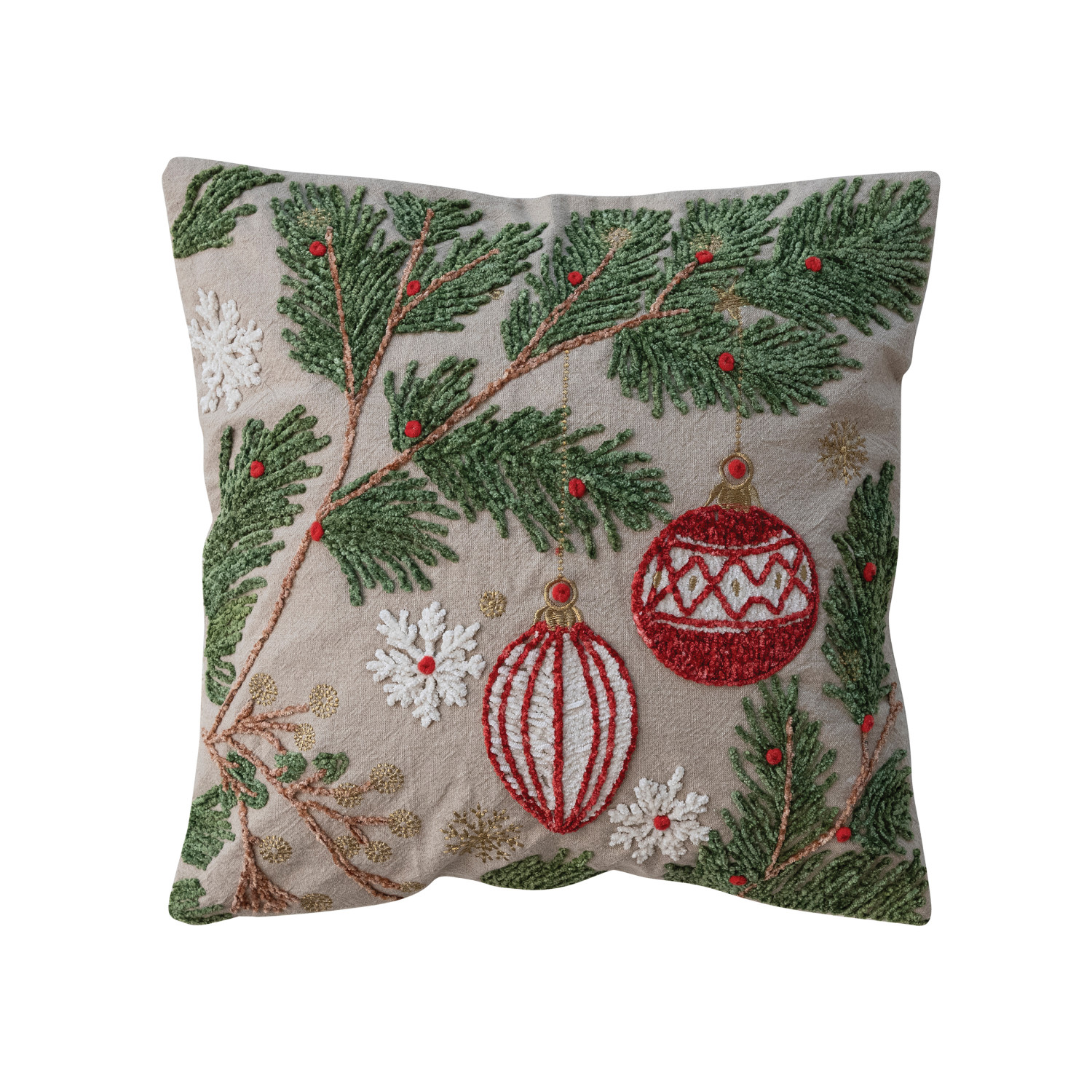18" Square Cotton Pillow with Embroidered Pine Boughs, Ornaments & Snowflakes